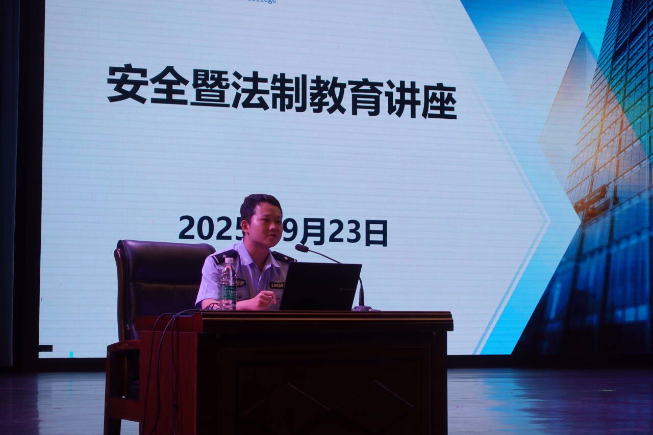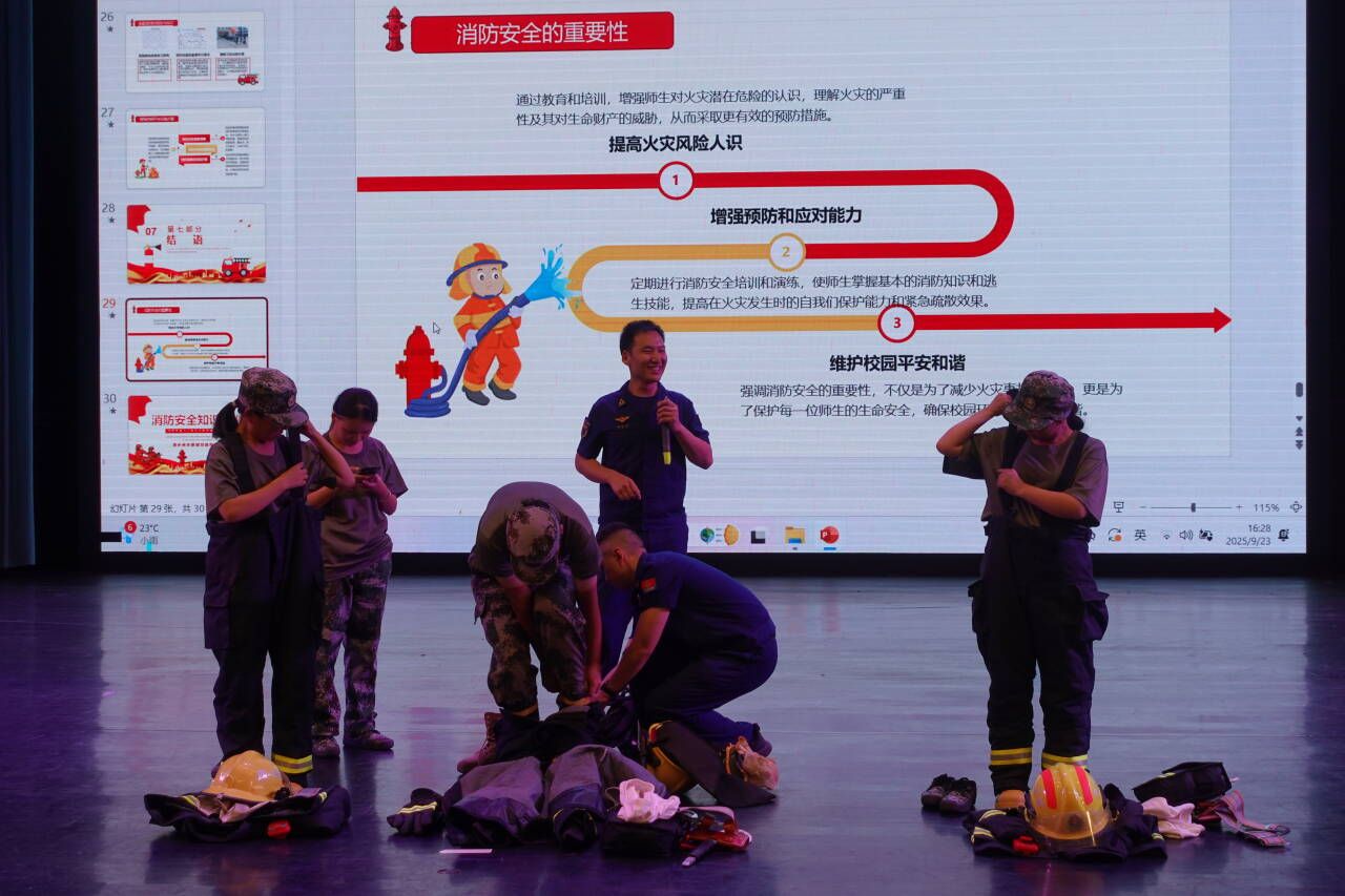 为全面加强校园安全管控,压紧压实安全责任,切实增强师生安全意识,学校在2025年新生军训期间,统筹运用“线下实操+线上直播”双载体,精心组织“三演六讲”安全教育系列活动,特邀请公安、消防、国家安全等领域专业人员现场授课,切实筑牢校园安全“防火墙”。