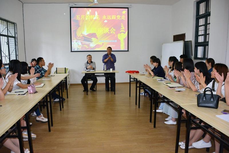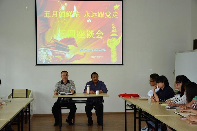 为大力弘扬五四精神,积极响应党的号召,2016年5月4日下午2:00,乐山职业技术学院财经管理系在新村校区创新创业俱乐部开展了隆重而庄严的“五月的鲜花 永远跟党走”五四青年专题座谈会,特邀财经管理系关工委林永庆(原乐山财贸学校副校长)、系副主任易新忠、刘锡辉、卿熠老师及团员代表、团支部代表、学生社团代表参加了本次座谈会。