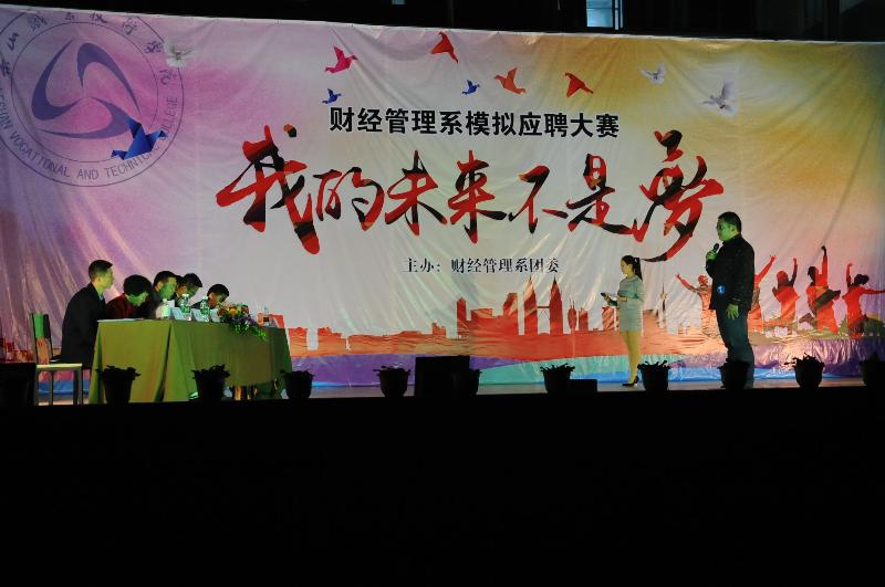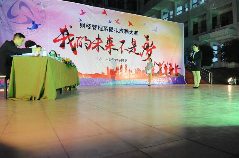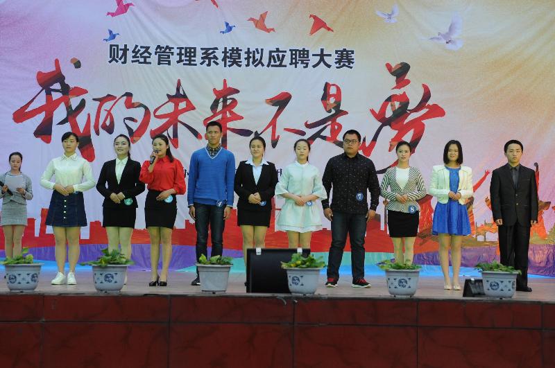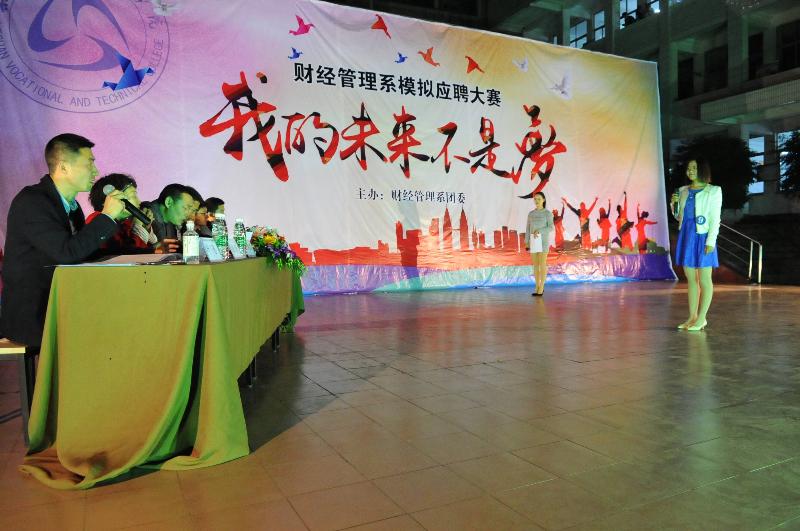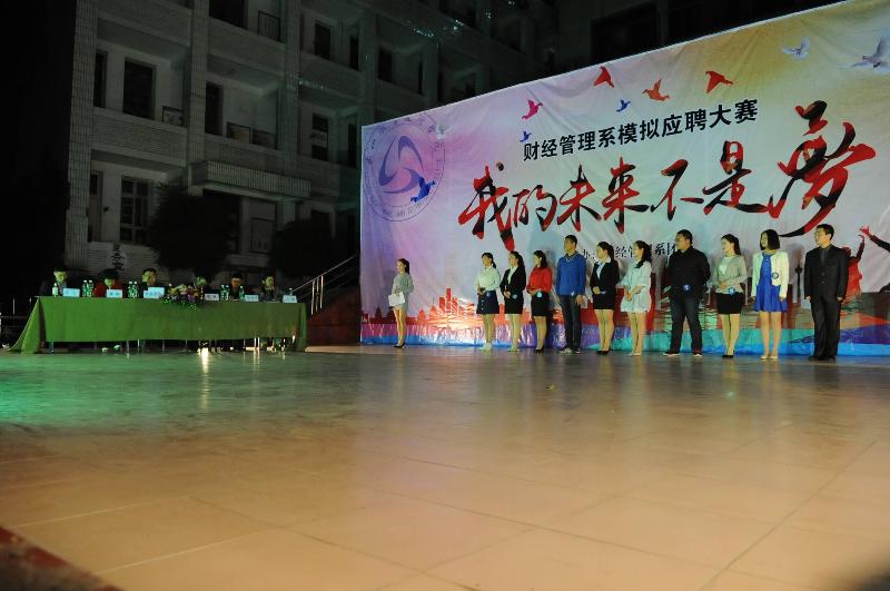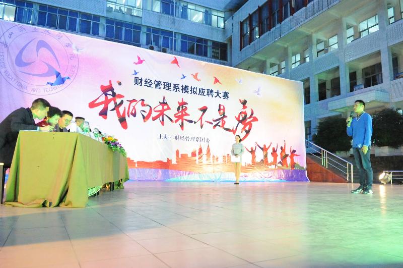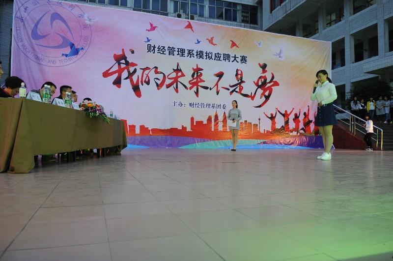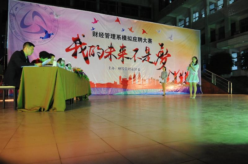 在当今就业形式下,应届大学生想找到一份理想的工作是不容易的。为了增强同学们的就业意识,培养同学们的面试技巧,让同学们在真正的面试中更得心应手,灵活应对求职挑战。2016年4月7日晚19:00整,乐山职业技术学院财经管理系在新村校区上操场开展“我的未来不是梦’模拟应聘大赛活动。