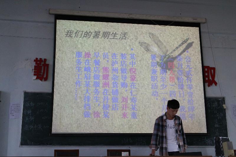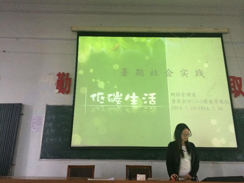 经过暑期漫长而艰苦的社会实践活动,2014年9月17日星期三下午2点,乐山职业技术学院财经管理系在综合楼四楼电教厅开展了暑期社会实践活动PPT交流大会。本次活动的评委学院学工部副部长、团委副书记罗建玮、学院团委干事桑郎翁确老师、我系团委干事卿熠老师。