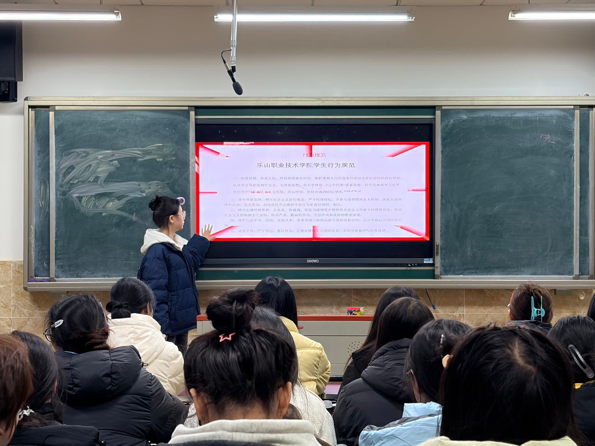 本次主题班会由学生会学习部组织,各班学习委员具体实施,主要学习《乐山职业技术学院学生行为规范》、《乐山职业技术学院学生违纪处分条例》和《乐山职业技术学院关于对学生考试违纪和作弊的处理规定》等相关制度,要求同学们严格遵守学校考试制度,规范行为,努力学习,认真复习,诚信考试。全体同学起立,郑重承诺严守纪律,笃志勤学。