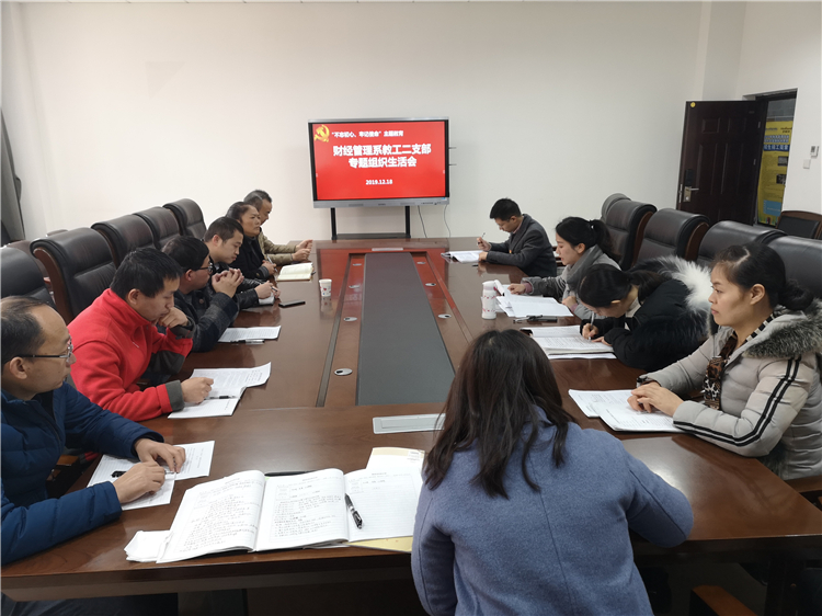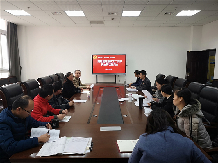 2019年12月18日,乐山职业技术学院财经管理系教工二支部在110会议室召开2019年度“不忘初心、牢记使命”专题组织生活会和民主评议党员。本次会议由纪检委员王悠主持,支部全体党员参加了会议,学院团委副书记、学工部副部长王渊民到位指导。
