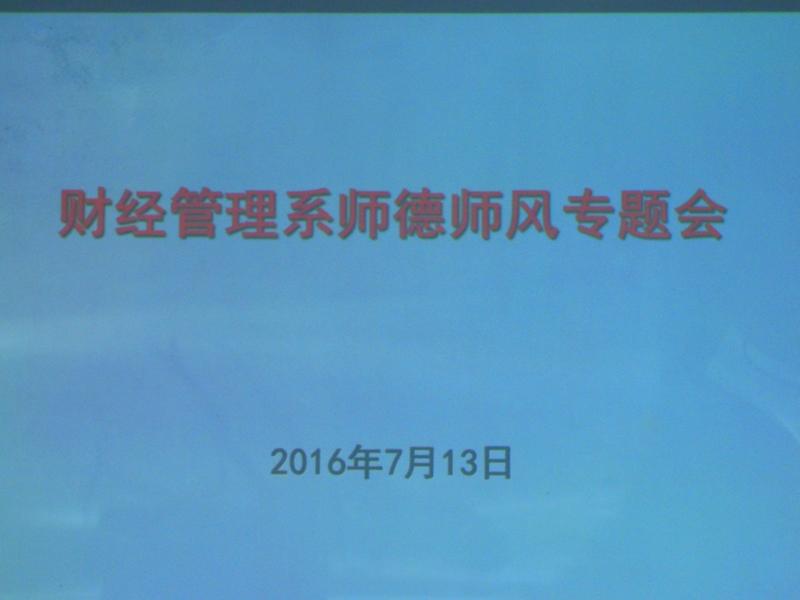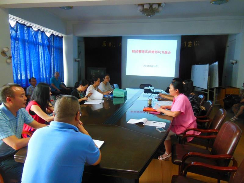 2016年7月13日上午9:00时,财经管理系在综合楼会议室召开全系师德专题学习会。会上,梅淑先同志组织大家全文学习文件:教育部关于进一步加强和改进师德建设的意见;建立健全高校师德建设长期机制的意见。