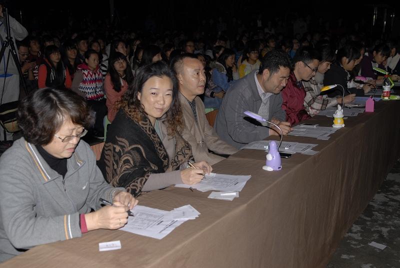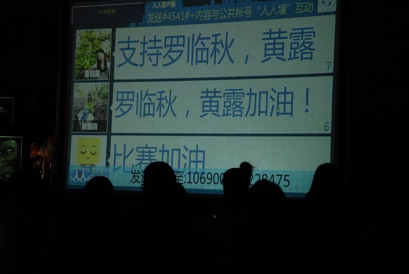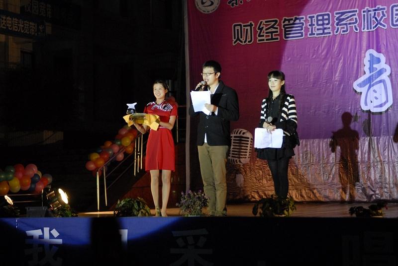 学院学生工作部副部长路喜苓、财经管理系副主任易新忠、学院吴鹰老师、桑郎老师、系学管办及全系学生观看了比赛。大赛共分为秀出自我,电影片段配音、观众抽奖三大环节。参赛者在“秀出自我”环节中,第一位选手伴着观众热烈的掌声来到舞台,他用高亢的歌声震撼了全场,在人人网的墙上赢得了很大的支持率。然而其他选手也不示弱,纷纷使出浑身解数,拿出看家本领让评委和观众们能够记住自己。一段“秀出自我”结束后,紧接着的是歌手大赛的选手们带来的歌曲,一首令人回味无穷《什么都可以》的歌声,丰富的情感将全场带到了又一个高潮。随后进行的是“电影配音”环节,选手们默契配合,用自己独特的方式将那些经典的电影片段进行了全新的诠释。第三环节就是现场观众通过发送短信或上人人网的方式为自己喜欢的选手加油助威,赢得人人网赞助的奖励。赛末桑郎老师为我们带来了一首《用心良苦》给整个比赛画上了完美的句号。在活动结束后,参加本次校园歌手大赛和主持人风采大赛的优秀选手也荣获了属于他们的荣誉和奖状。