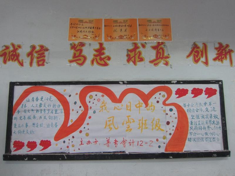 为了促进我系“风云争霸赛”,增强同学之间的团结精神,体现班级特色。2013年10月13日星期一,乐山职业技术学院财经管理系开展了以“我心目中的风云班级”为主题的墙报评比活动。本次活动主要是由我系团委宣传部负责,本次活动的主题是“我心中的风云班级”。