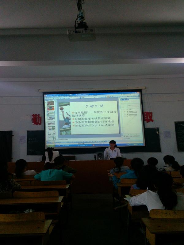 大会首先向社员们简单的介绍了篮球社的主要活动和社团的PPT展示,接着介绍了本期篮球训练的教练员周林、钟小桃,由周林为大家介绍本期的学期安排和本期系部篮球赛具体安排,以及对社员给予殷切的希望!最后进行了社员自我介绍环节,并且竞选新社员组长等相关事项。
