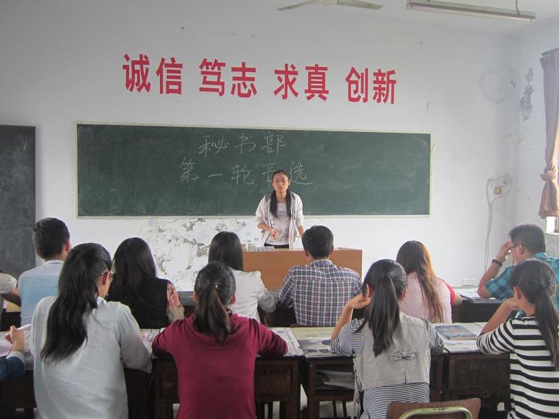 2013年9月24日下午5点整,乐山职业技术学院财经管理系学生会秘书部在综合楼四楼多媒体室进行了一年一度的招新面试演讲,招新会由学生会秘书部部长主持,此次招新面试特邀请团委副书记、学生会主席、社团联合会主席以及其他学生会各部门的部长担任评委。