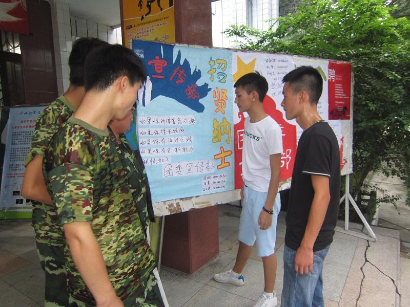 为了迎合同学们的军训时间,团委、学生会、社团联合会的学生干部们将晚上9点到10点的时间段定为纳新宣传时间。晚上九点整,纳新工作如火如荼的开展着,学生干部浩浩荡荡向新生寝室进军。到各新生寝室后,积极宣传团委、学生会、社团联合会等各个学生组织以及各自管辖的部门。新生们对系级学生组织表现出空前的积极性,他们纷纷向学生干部们咨询如何竞聘学生组织,学生干部们对新生们提出的问题进行了详尽认真的回答,并对有意愿加入团委、学生会、社团联合会的同学做了相关记载。