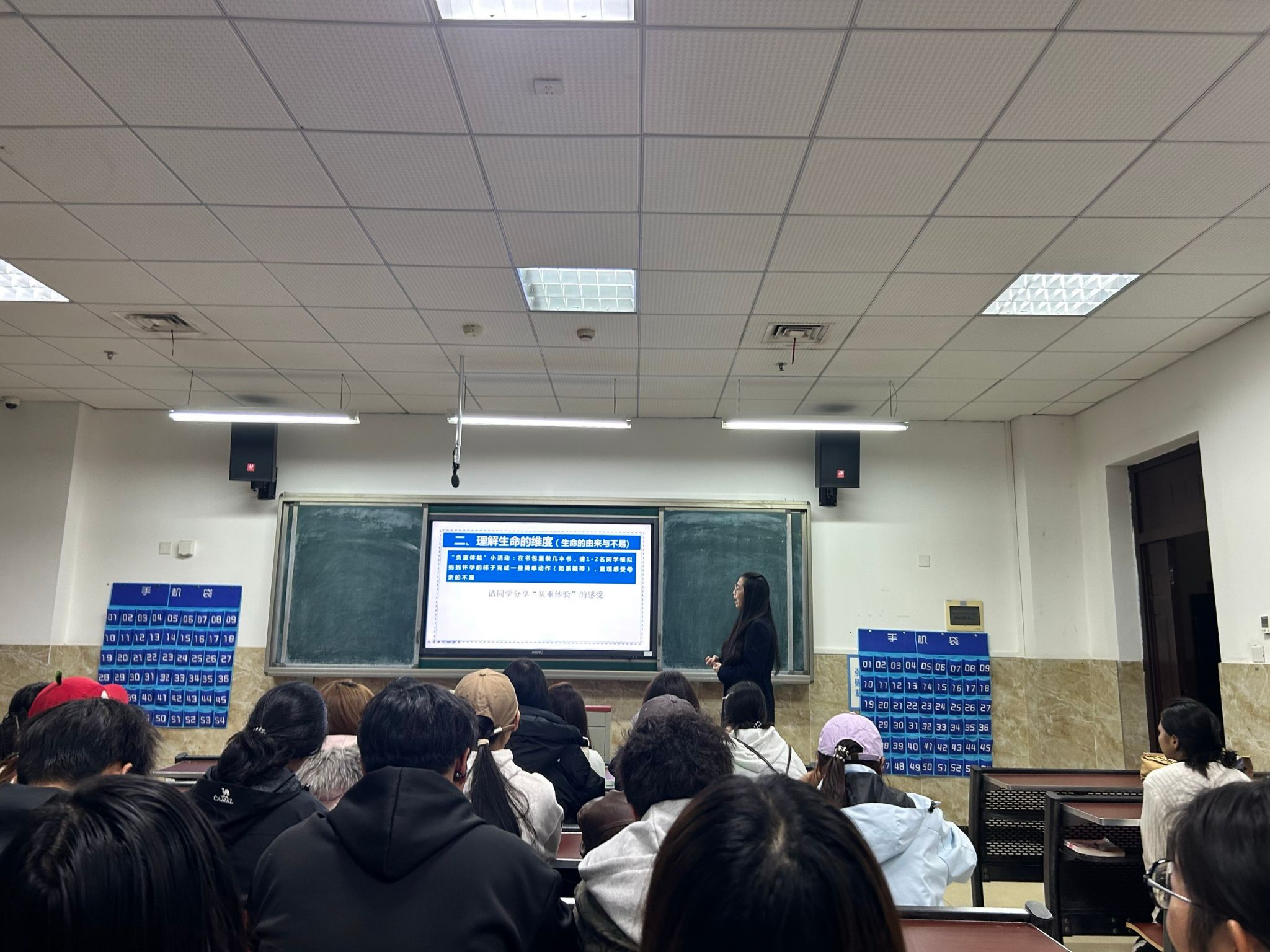 辅导员让全体同学“屏住呼吸30秒”,感受生命存在,生命的可贵;讲述一个人的出生、成长历程,让同学们体验生命的由来与不易;分享乐山女孩雷庆瑶的故事,鼓励同学们始终积极面对人生,理解生命的维度,让自己的生命丰富且有价值。