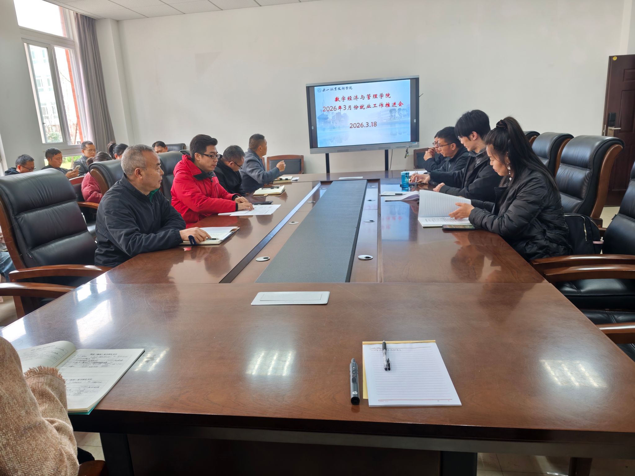 2026年3月18日下午,乐山职业技术学院数字经济与管理学院在2号教研楼110会议室召开2026年3月就业工作推进会。学院党总支书记黄泓轲、院长邵其会、总支专职副书记易新忠、副院长何瑞及全体专兼职教师参加会议。