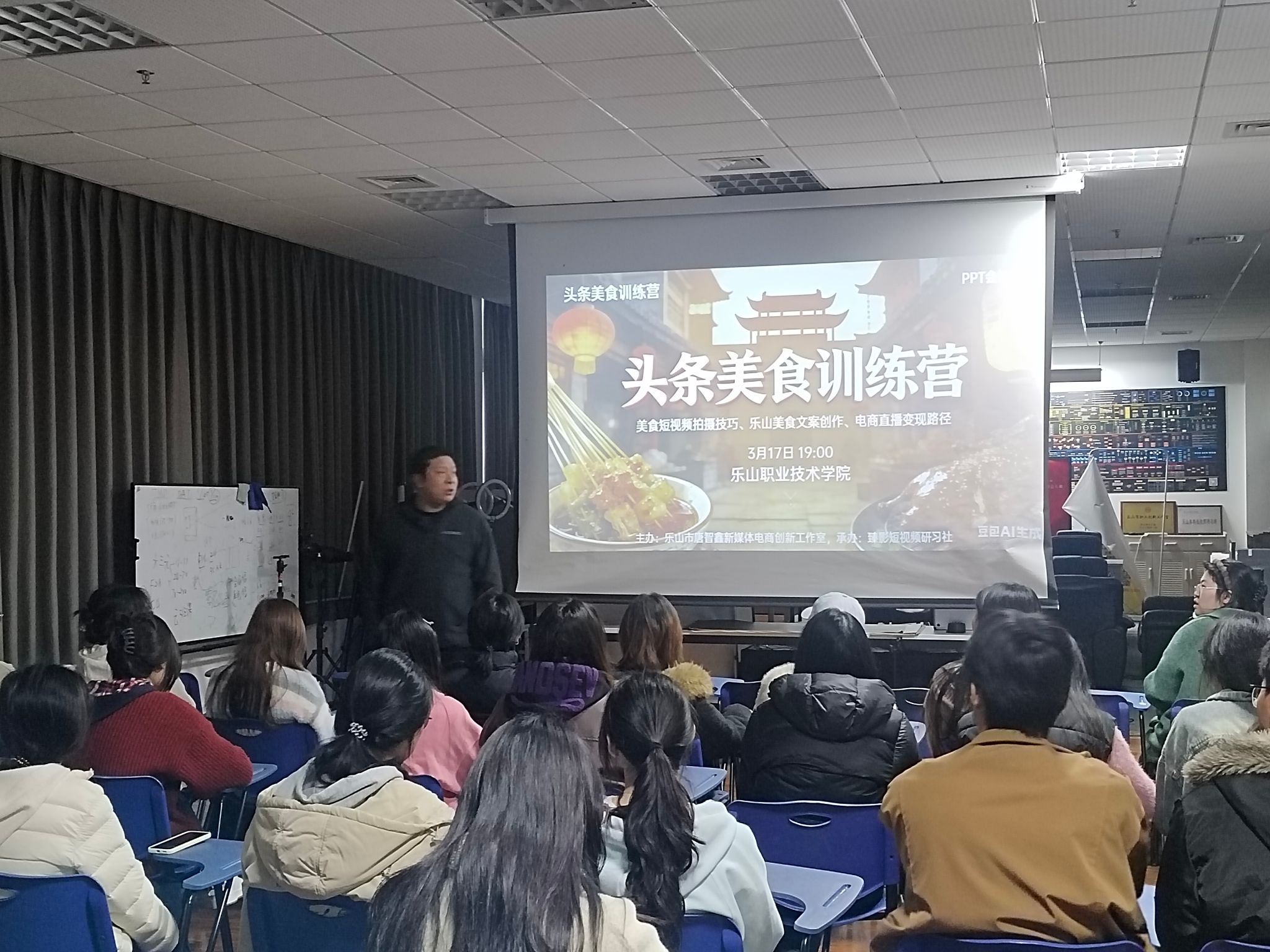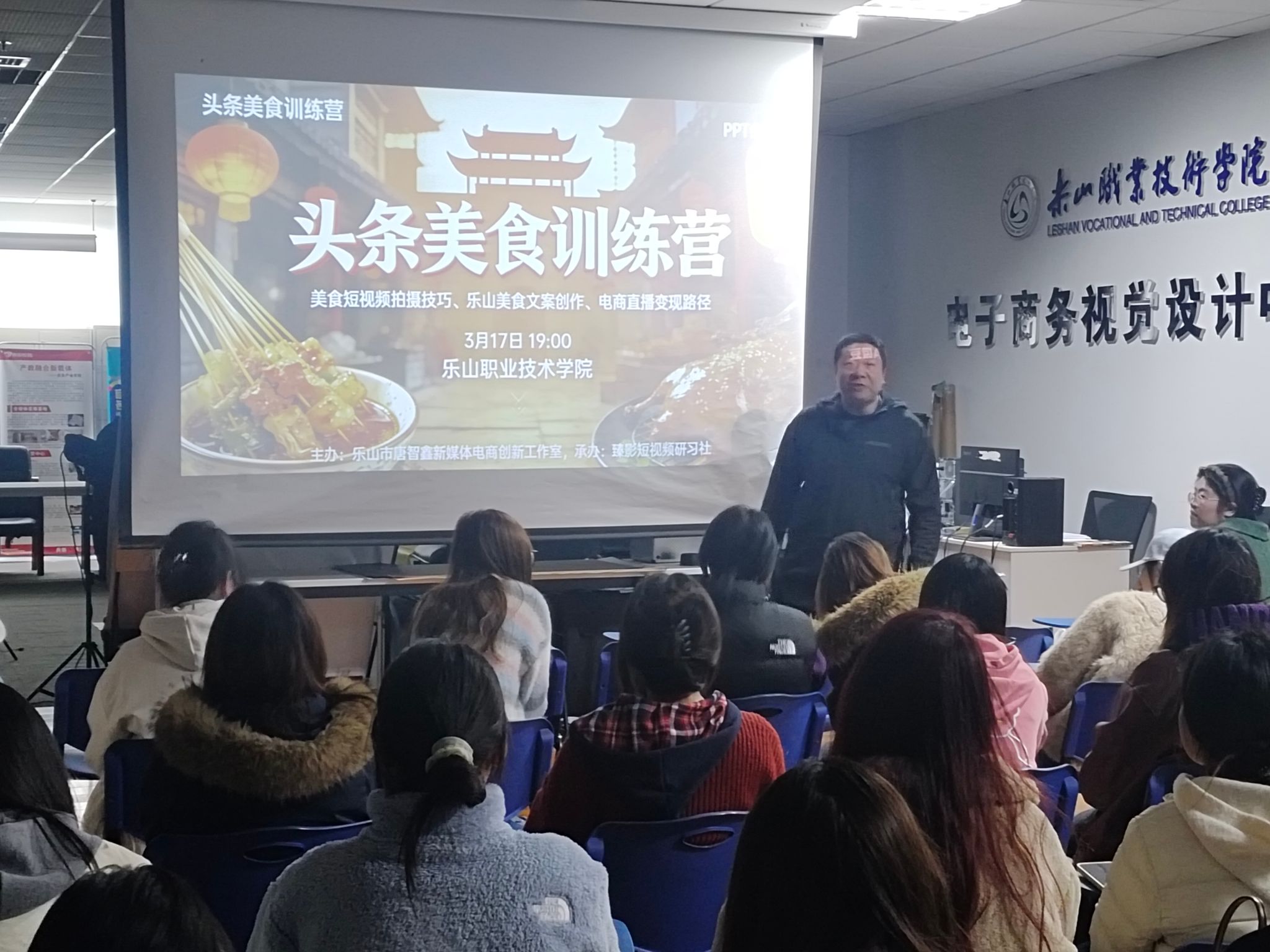 为深入贯彻落实乐山世界美食之都创建发展大局,进一步提升我校师生新媒体内容创作与电商运营能力,3月17日晚,由乐山市唐智鑫新媒体电商创新工作室主办,臻影短视频研习社承办的“头条美食训练营”在我校顺利开营。本次活动吸引了 30 余名师生踊跃参与,共同探索美食图文创作、乐山本土美食文案打造及电商变现路径,以实际行动培育优质美食博主,讲好乐山味道故事,向世界传递嘉州美食魅力。