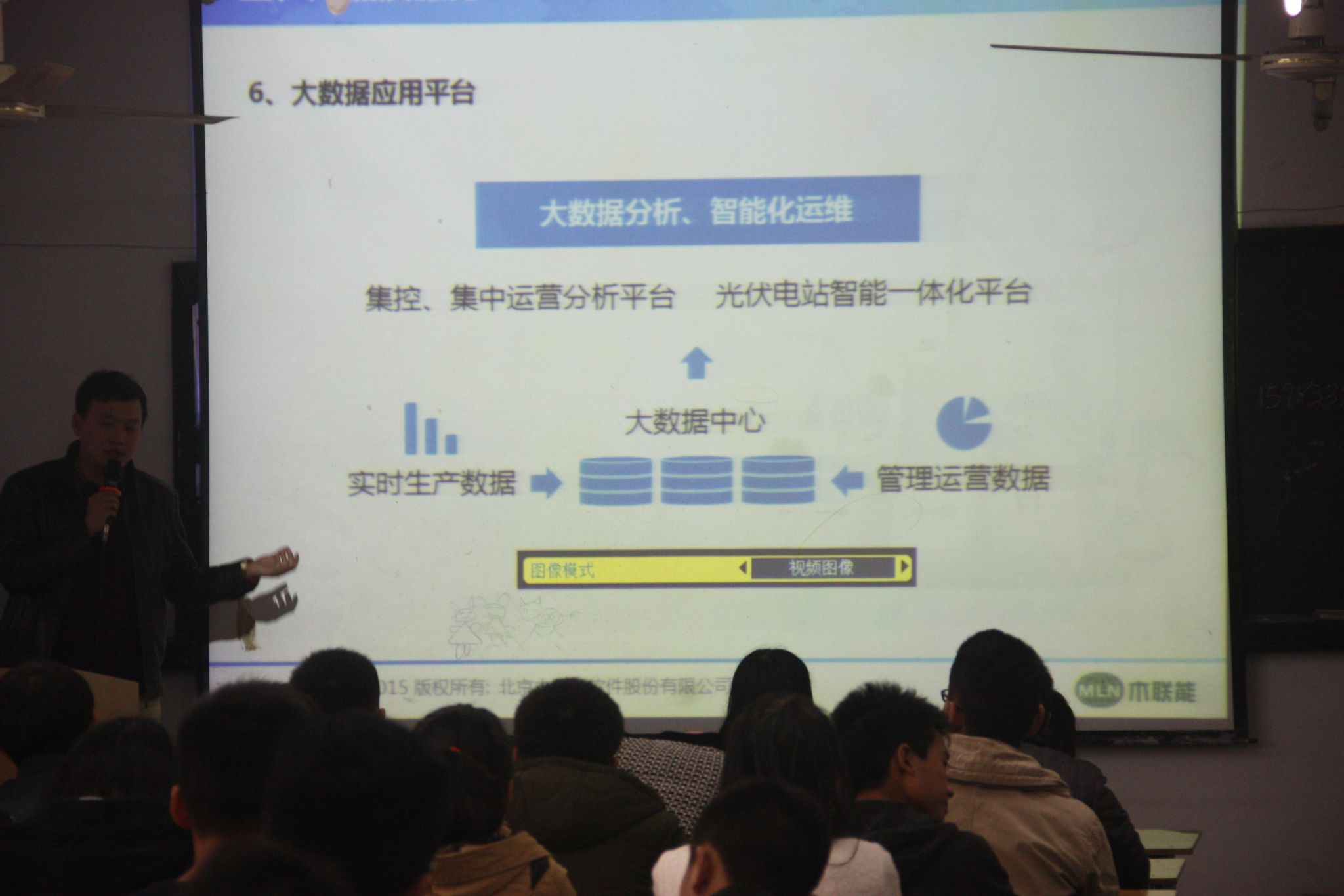 然后由北京木联能软件技术股份有限公司副总经理李韧做学术讲座。李总简单介绍了公司基本情况、核心业务、战略发展目标;对可再生新能源整体解决方案、光伏发电智能化解决方案、大数据分析、智能运维等进行了深入浅出的阐述。最后李总还对新能源及光伏产业的发展前景做了一个展望,鼓励同学们珍惜现在的学习机会,牢牢把握光伏发电大发展的大好时机,积极投身新能源产业。