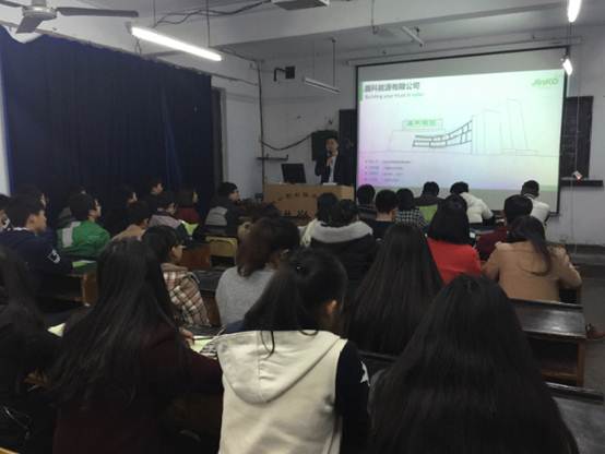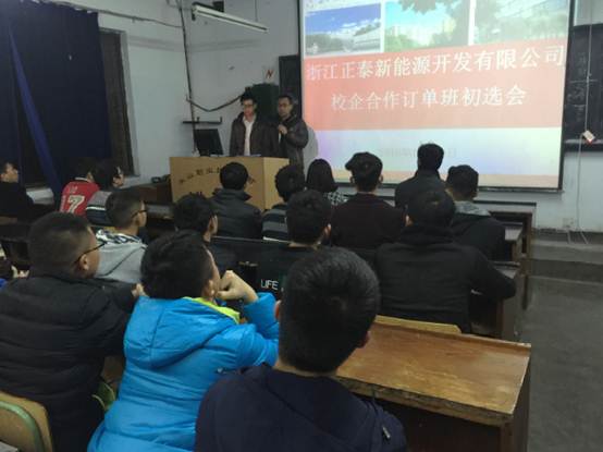 2016年12月21、22日分别邀请浙江晶科能源、浙江正泰新能源到校,召开订单班初选会。“晶科能源班”、“正泰新能源班”订单班初选会采用集中宣讲、分组面试的方式开展,宣讲会场气氛活跃,同学们认真听取公司领导对行业、企业现状的分析,并积极踊跃提问。会后通过分组面试分别选拔出近90名同学进入订单班初选名单。