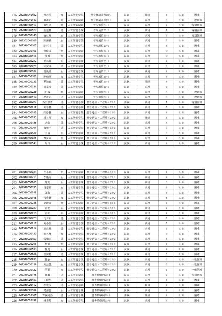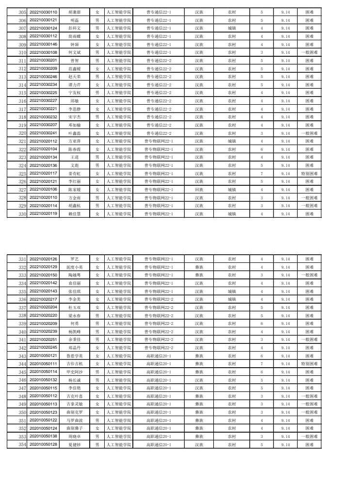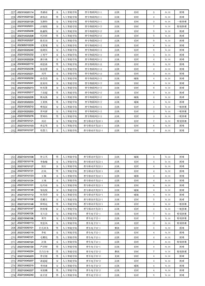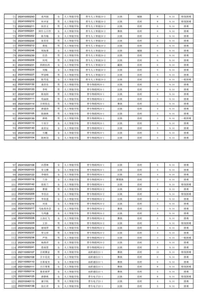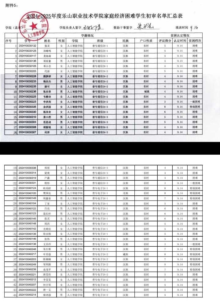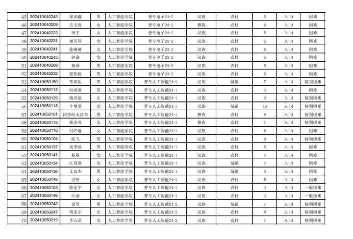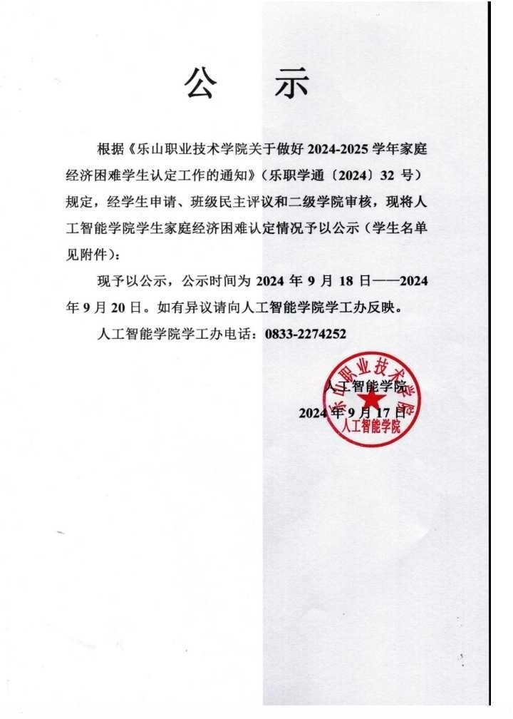 公示 据《乐山职业技术学院关于做好2024-2025学年家庭经济困难学生认定工作的通知》(乐职学通(2024)32号)规定,经学生申请、班级民主评议和二级学院审核,现将人工智能学院学生家庭经济困难认定情况予以公示(学生名单见附件): 现予以公示,公示时间为2024年9月18日﹣-2024年9月20日。如有异议请向人工智能学院学工办反映。 人工智能学院学工办电话:0833-2274252 编辑:晏小雯 一审:朱玲玉 二审:张素芬 三审:王明清