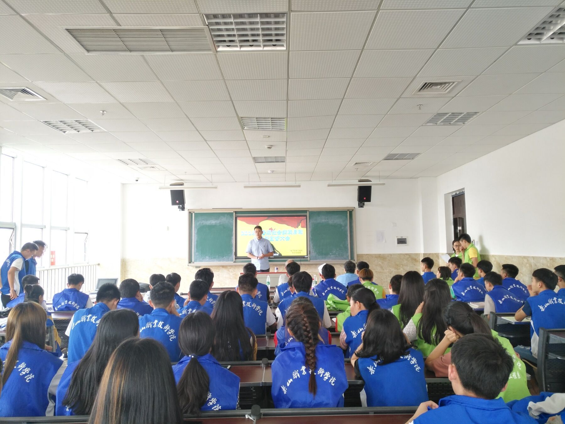 本次大会分为六项。一、由主持人向大家介绍了参加本次大会的领导:罗贤副主任、王道康老师与童汉生老师。二、主持人向我们介绍了社会实践活动的重要性,并且罗主任与童老师也依次上台来与我们分享社会实践的意义以及自己对它的理解。三、由团委副书记李雨为我们播放我院各系在2017年暑期社会实践优秀视频,并且2017年暑期社会实践团队“奔跑吧三班”代表也上台为我们讲述了社会实践的重要意义。四、由社会实践部部长向我系2018暑期社会代表团队授旗。五、宣誓人带领我们宣誓。六、进行本次大会签名环节,有老师们进行代表签字。