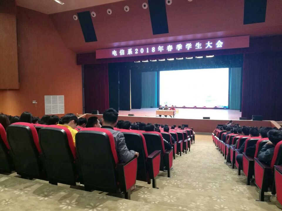 为了鼓励同学们努力学习,提升自己,让自己多方面的发展。电信系于2018年3月14日下午两点在礼堂开展了学生大会。主讲人分别是电信系党支部书记朱文彬朱书记、电信系副主任罗贤罗主任、中兴通信学院副院长王显炳王院长。参加本次大会的还有学管办老师、各班辅导员和电信系全体同学。