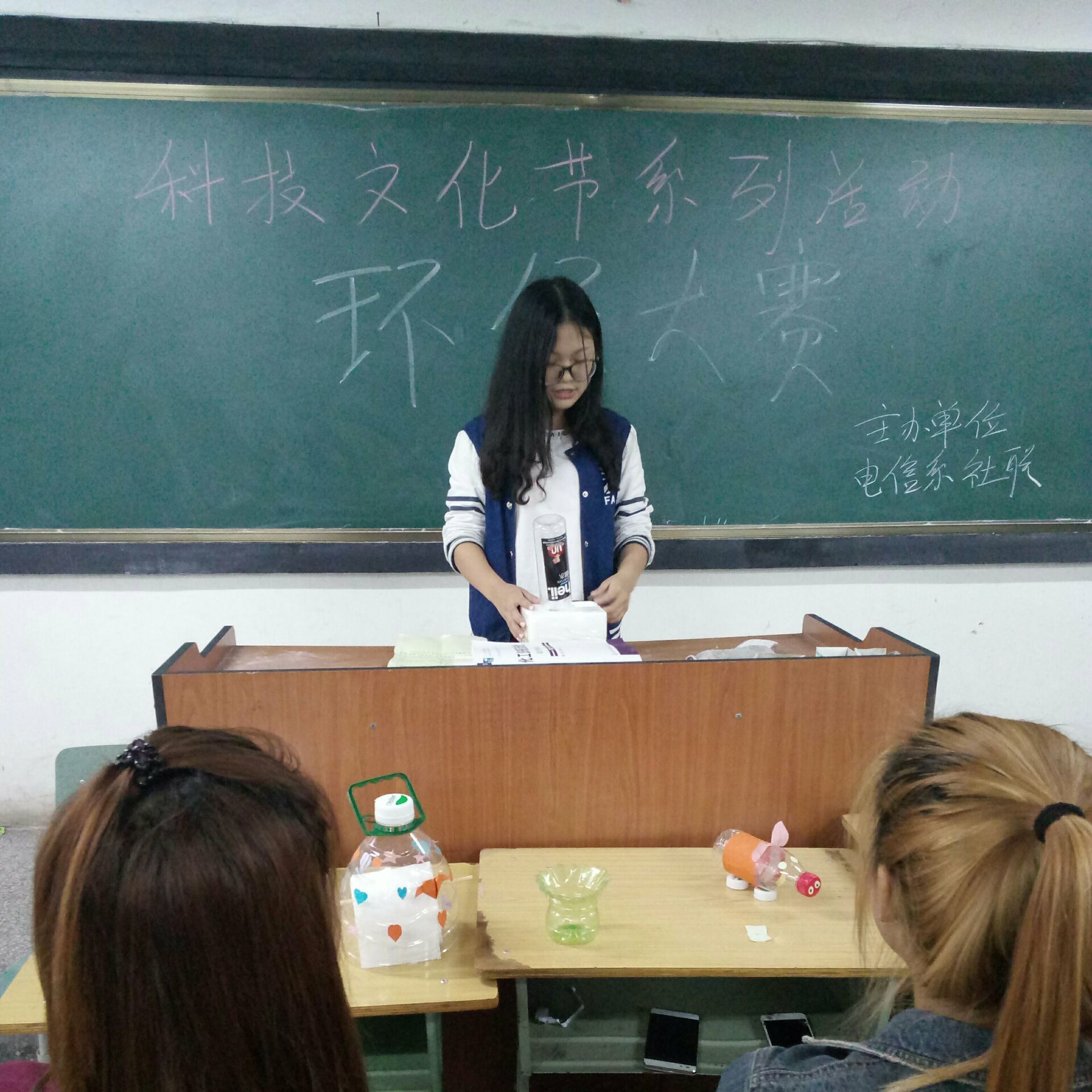 电信系于2016年5月25日下午7点在502教室举办“环保创新大赛”,旨在让同学们养成废物利用与节约资源的良好习惯,改变同学们头脑中的传统思维模式,树立创新意识。同学们踊跃参赛,表现出对环保的设计与制作的极大兴趣。