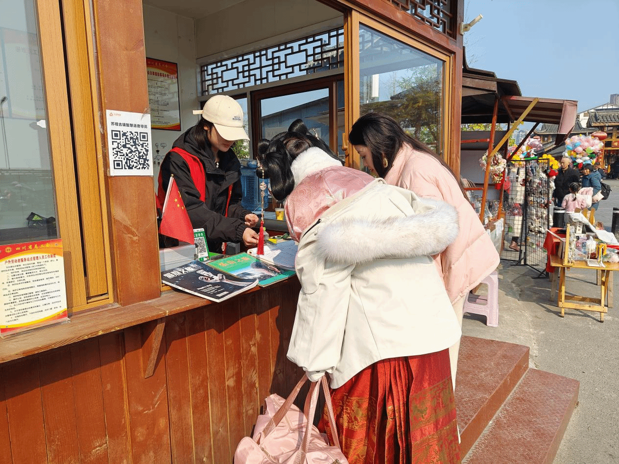 本次活动共分为四个小组,分别前往四个不同的点位,为游客们提供了以下服务:协助寄存行李、分发宣传传单、介绍景点并引导游客游览、定时清理街道垃圾以保持环境卫生,以及协助集镇管理人员疏导交通。这些服务不仅让游客们真切体验到了苏稽古镇的温馨服务,还有效推广了苏稽古镇的传统美食。