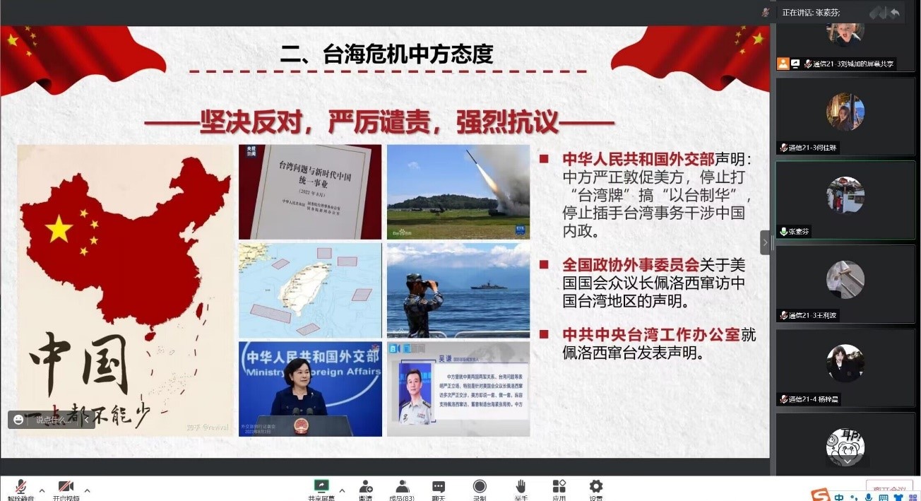 会上,辅导员老师通过班会让学生进一步了解疫情防控相关知识,要求所有学生居家健康观测,注意疫情防护,不得前往中高风险地区,每日按时按要求填写健康上报为返校做充分准备,未接到通知前,不得提前返校。第一,结合当下台海形势,通过PPT,教育引导学生结合所见所闻、所历所获、所感所悟进一步深化爱国认识,激发学生爱党爱国爱社会主义爱人民的巨大热情,让爱国主义精神在青年学子心中牢牢扎根,进一步厚植家国情怀。