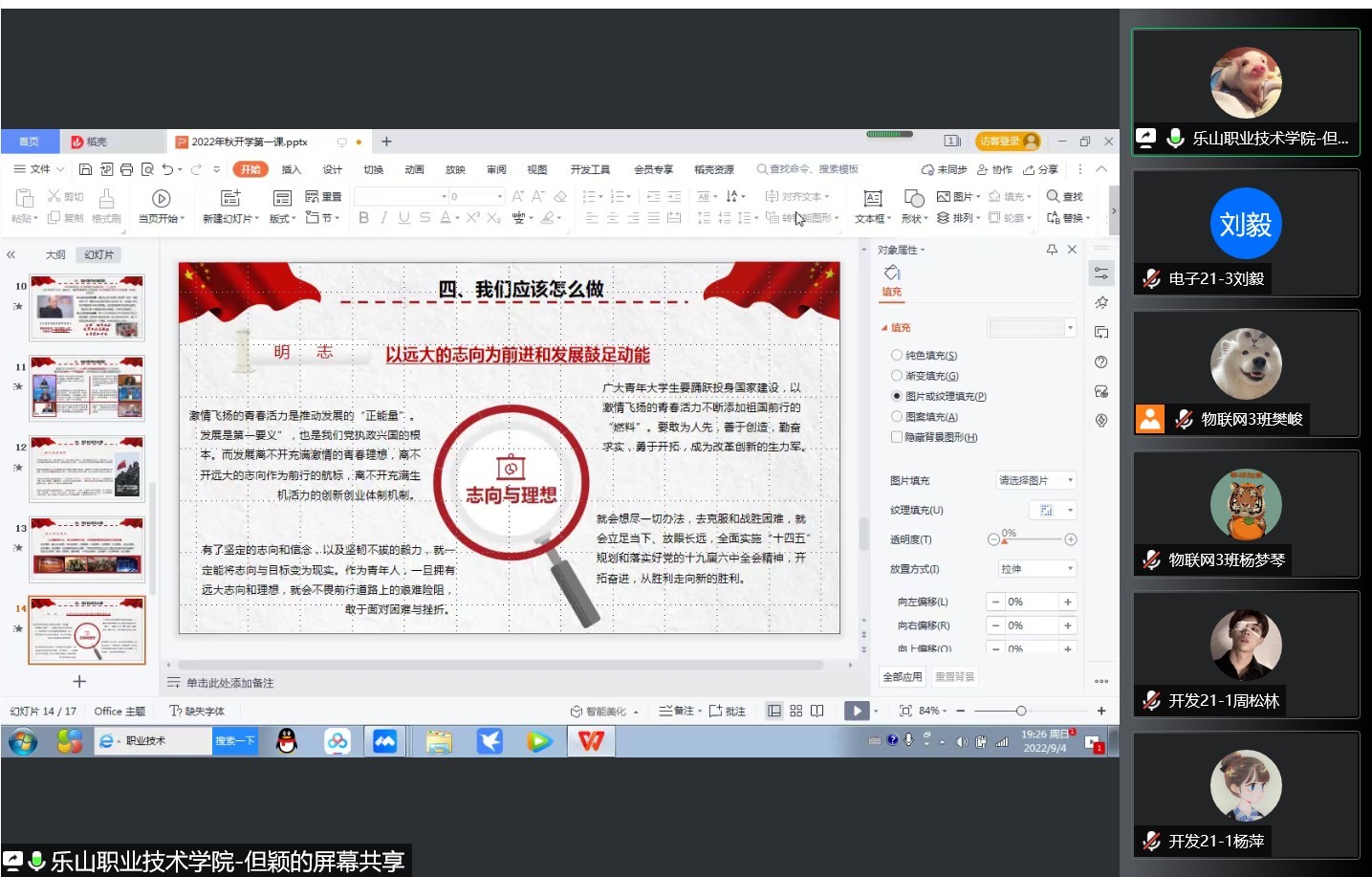 为加强疫情防控教育和引导,弘扬爱国主义精神,准确掌握学生实际情况,教育学生回归学习状态,确保开学各项工作有序进行,电信系各班于 9月4日晚相继在各班召开了新学期“开学第一课”主题班会。会议由各班辅导员主持,通过腾讯会议方式召开,各班全体同学参加。