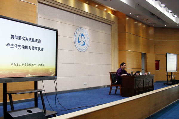 本次活动邀请到中共乐山市委党校法学教研室主任、法学教授沈建军主讲,沈教授结合乐山本地的实际情况和当代大学生的特点,从我国宪法的变迁、宪法修改的原则(2018年宪法修正案)、宪法修改的内容(2018年宪法修正案)三个方面出发,生动形象地为师生们做了题为《贯彻落实宪法修正案,推进依宪治国与依宪执政》的宣讲。