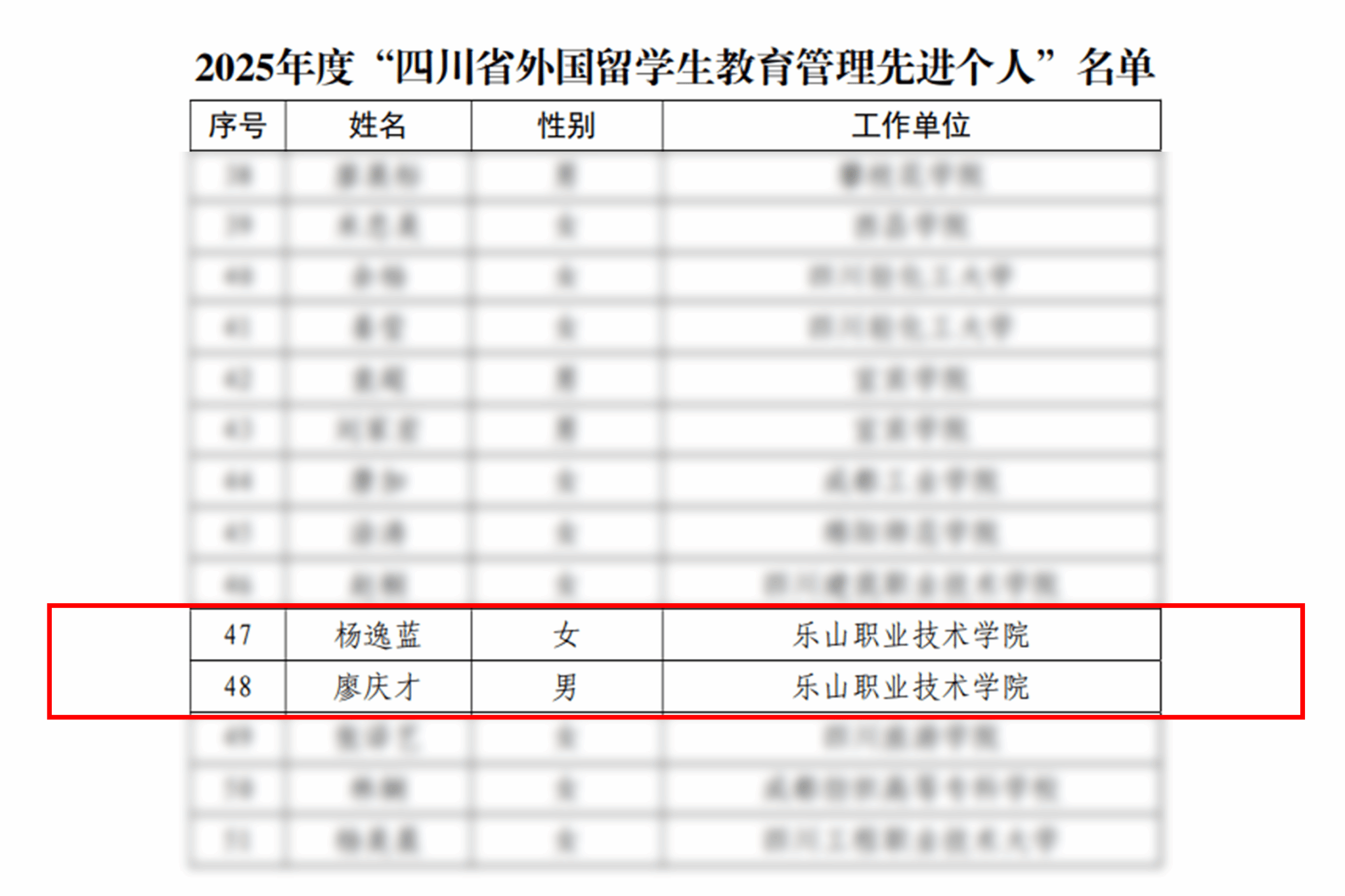 近日,四川省高等教育学会外国留学生工作专业委员会公布了2025年度“四川省外国留学生教育管理先进个人”名单,乐山职业技术学院杨逸蓝、廖庆才两位老师凭借在留学生教育管理一线的突出表现,成功入选。
