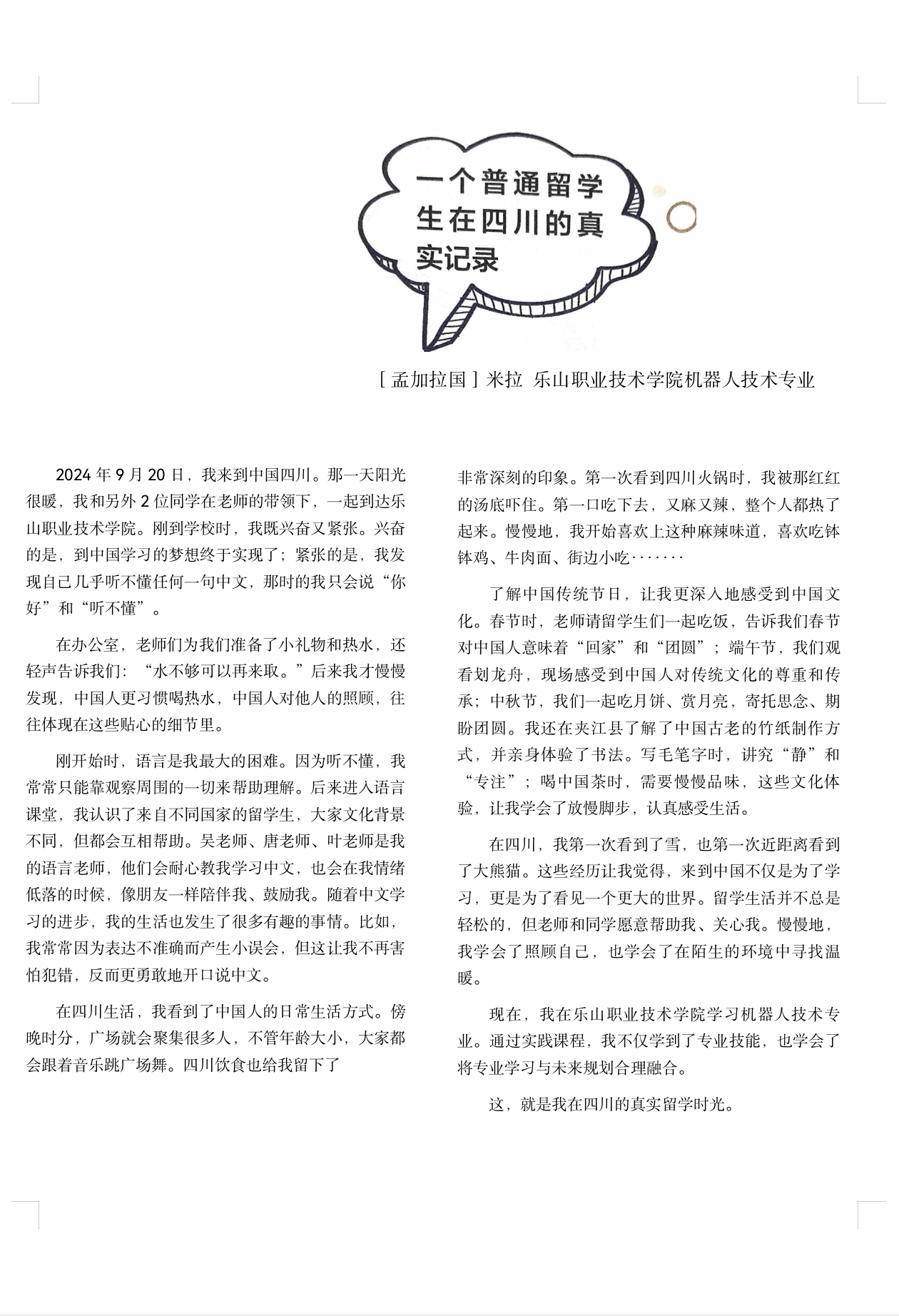 近日,乐山职业技术学院智能制造学院机器人技术专业留学生米拉撰写的一篇记录其在四川留学真实经历的文章,被刊登在知名职业教育杂志《当代职校生》2026年第2、3期合刊上。