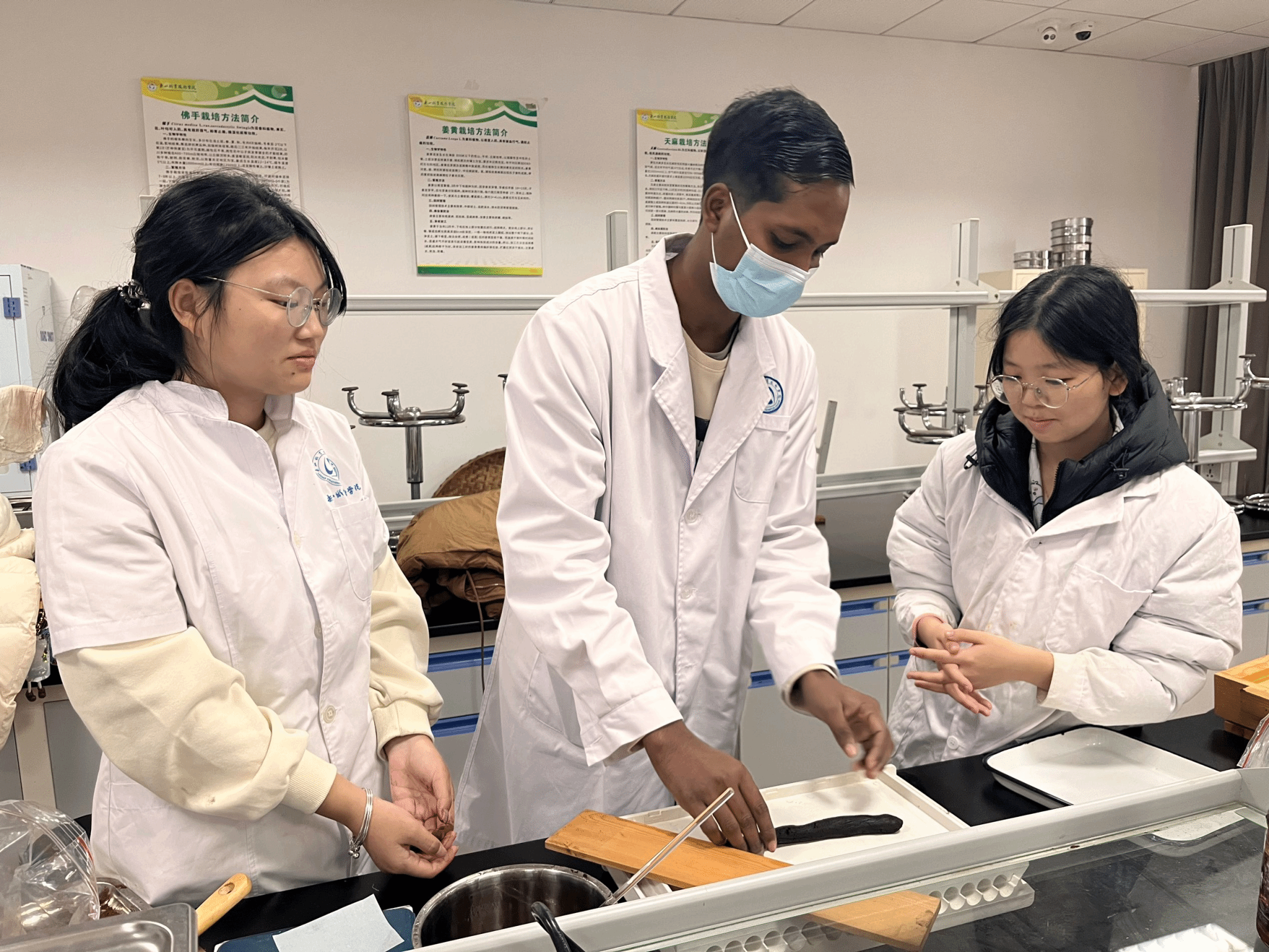 生物医药学院阳和养生社于2025年11月20日下午在实训楼开展亲手制作“东方巧克力”,探寻脾胃健康的养生智慧主题活动。此次活动由阳和养生社团指导老师周莉江、来自老挝、孟加拉国、柬埔寨的留学生及阳和养生社社员共同参与,留学生们在传统中药养生体验工坊感受中医药养生文化的魅力。
