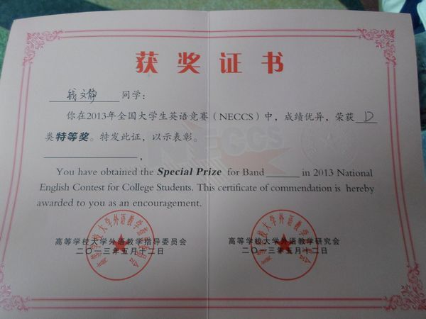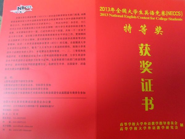 5月下旬,钱文静同学参加了2013年全国大学生英语竞赛,赛事分为初赛、复赛、决赛。钱文静同学通过初赛后,在决赛中凭借自己的实力,经过层层口试、笔试的激烈角逐,取得了可喜成绩。