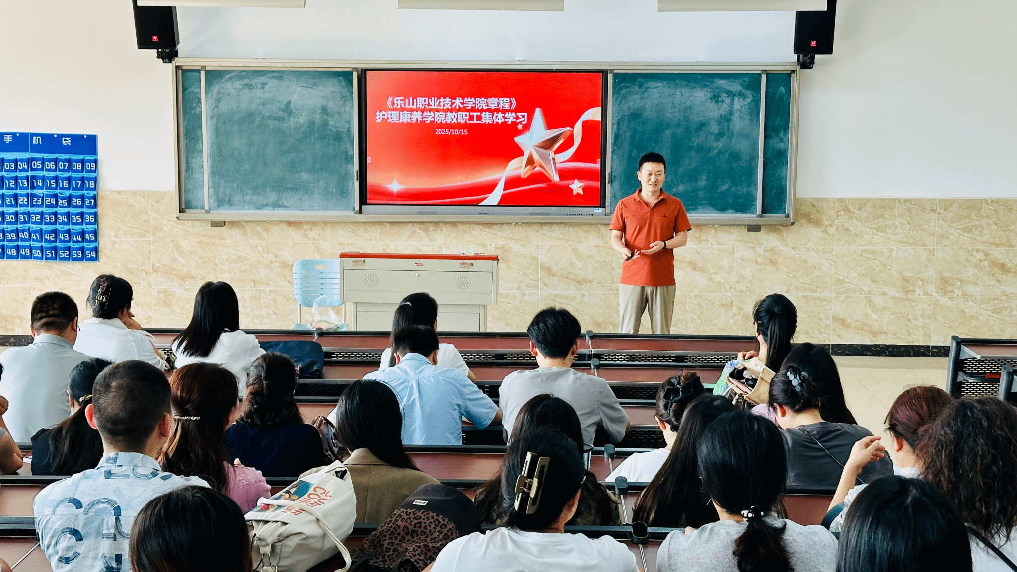 为深入推进依法治校,强化学院内部治理,提升全体教师的制度意识和规矩意识,2025年10月15日,护理康养学院在2C302教室组织开展了《乐山职业技术学院章程》(以下简称《章程》)专题学习会。本次学习由学院分管教学副院长张磊领学,护理康养学院全体教师参加了学习。