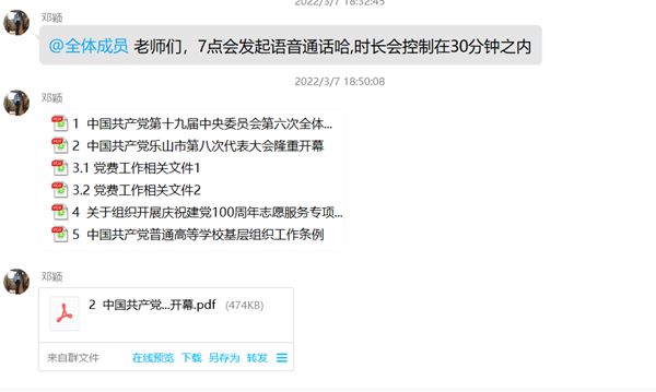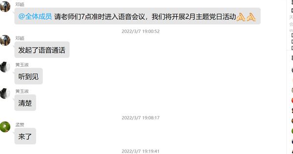 2022年3月7日19时,护理系教工一支部采用QQ语音会议形式开展 “原原本本学文件,切实打牢思想基础”主题党日活动,活动由支部书记邓颖主持。