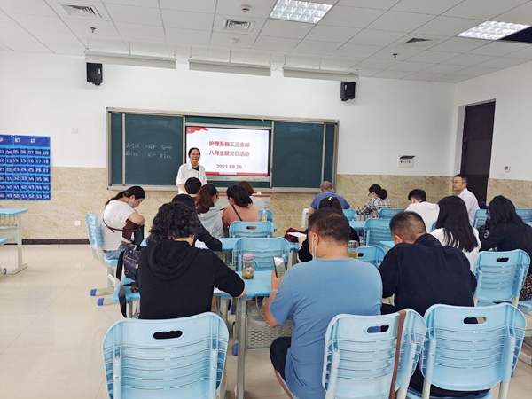 2021年8月26日上午10点,护理系教工三支部的全体党员在2号教学楼2A304教室开展主题党日活动。活动由支部书记祝青主持,活动主题是:发挥基层党组织战斗堡垒作用,打赢疫情防控和防汛救灾硬仗。