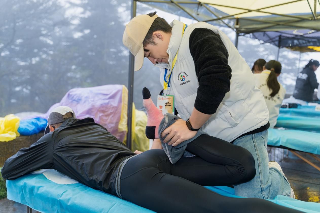 赛事当天,师生团队凌晨5点便抵达终点康复服务站投入工作。上午10时左右,一名27公里组选手出现小腿肌肉痉挛,志愿者迅速运用“扳机点按压技术”配合冰敷,15分钟内缓解其疼痛。团队还通过动态拉伸、物理治疗等方法,为近200人次选手提供赛后恢复服务,处理运动损伤十余例,获得选手和组委会的一致好评。