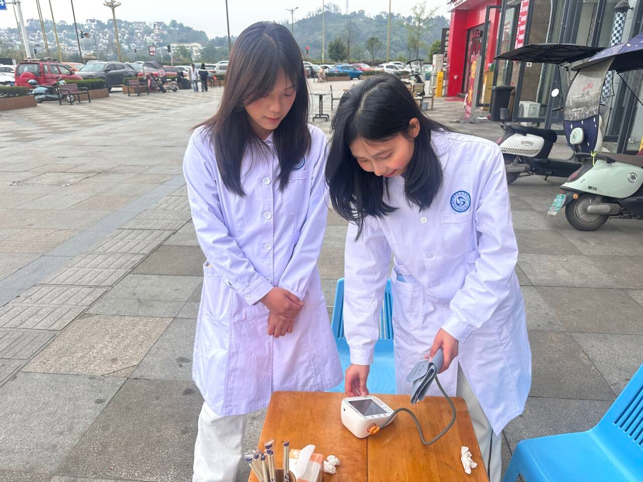 除广场服务外,师生还为社区高龄、独居老人提供上门血压测量服务,全程注重秩序引导、隐私保护与医疗应急准备,确保活动安全有序开展。