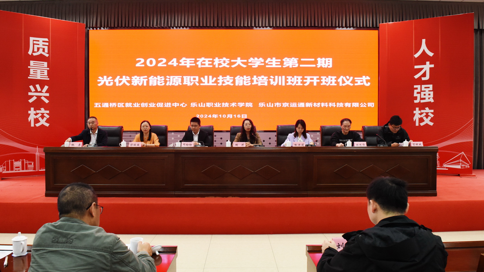 2024年10月16日,乐山职业技术学院2024年在校大学生第二期光伏新能源职业技能培训开班仪式在学术交流中心3004会议厅举行。学校党委委员、副校长周芹,五通桥区就业创业促进中心主任张源莉出席开班仪式并讲话。乐山市京运通新材料科技有限公司相关领导,学校继续教育学院和新能源与材料学院相关负责人,200余名师生参加开班仪式。