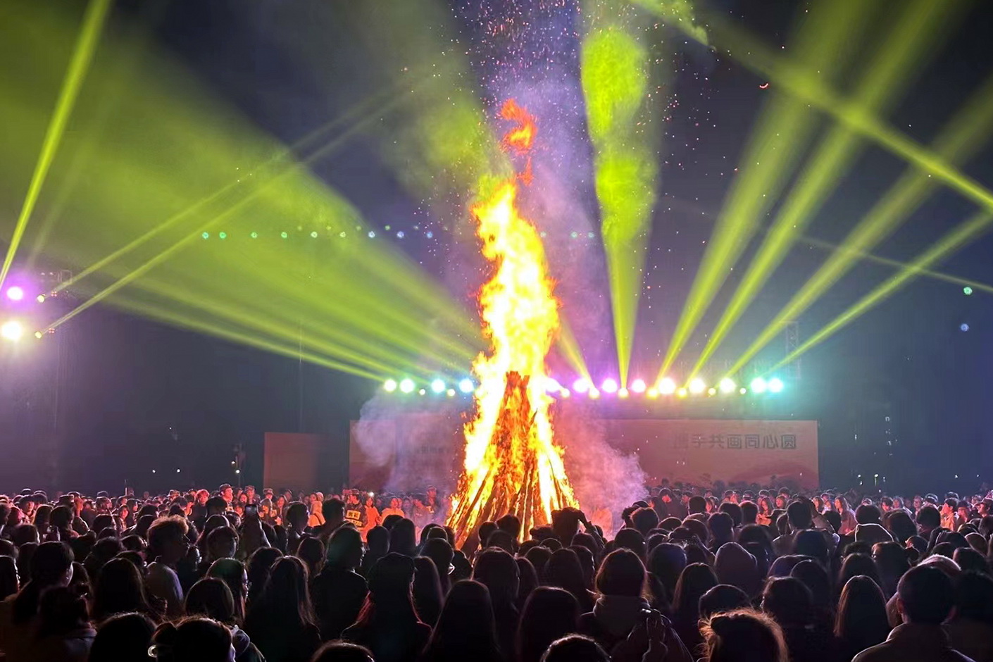 2023年11月19日,晚上7:00,各民族学生聚集在明德广场,参加“中华民族一家亲,携手共画同心圆”民族团结主题篝火晚会。晚会由乐山职业技术学院学生工作部部长胡文杰主持,乐山市民族宗教委员会二级调研员欧崇钦,乐山市市中区苏稽镇人民政府镇长徐彬菱,学校党委委员、副校长张学河,党委委员、副校长封家福等领导出席活动。欧崇钦、封家福先后致辞,向彝族学生送上了新年祝福,希望同学们铭记团结诞生兴旺,凝聚产生力量的真理。随后,张学河宣布“中华民族一家亲,携手共画同心圆”主题篝火晚会正式开始。各民族学生围着热情的火焰,大家手牵着手,伴随欢快的音乐跳起了醉美达体舞,印下了中华民族一家亲,携手共画同心圆的美好画卷。