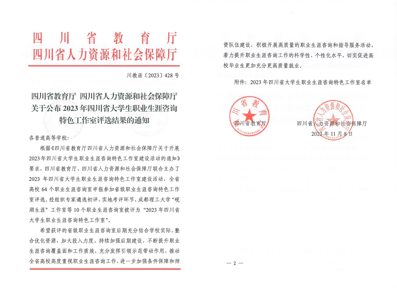 11月8日,四川省教育厅、四川省人力资源和社会保障厅发文公布“2023 年四川省大学生职业生涯咨询特色工作室评选结果”,乐山职业技术学院“青江启航——大学生职业咨询与就业指导工作室”上榜,是首批省级大学生职业生涯咨询特色工作室中唯一入选的高职专科学校。