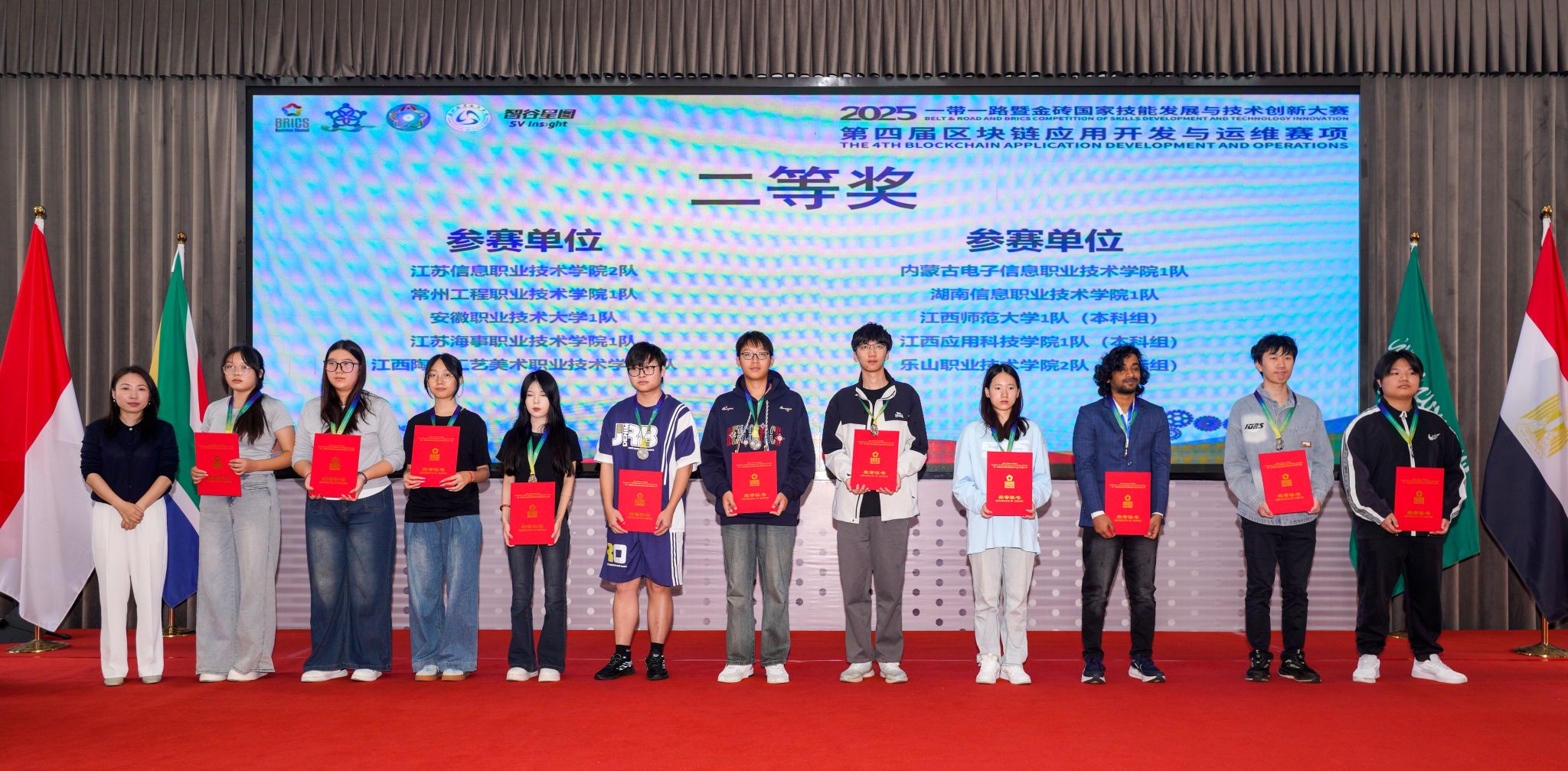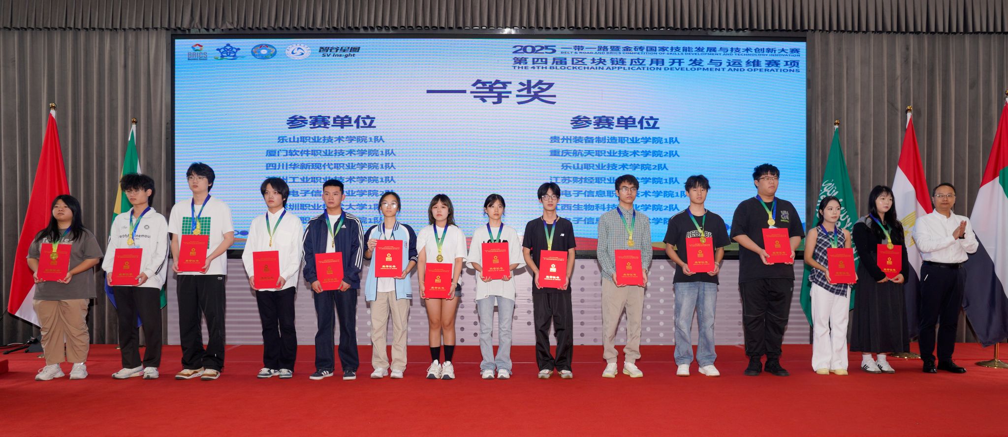 10月17日,2025“一带一路”暨金砖国家技能发展与技术创新大赛之第四届区块链应用开发与运维赛项在我校举行,人工智能学院组织四支队伍参赛。经过紧张激烈的比赛,我校学生共获得高职组、国际组三个一等奖,同时获得国际组二等奖。本届大赛由金砖国家工商理事会中方理事会、“一带一路”暨金砖国家技能发展国际联盟、“一带一路”暨金砖国家技能发展与技术创新培训中心、中国发明协会、教育部中外人文交流中心主办。我校作为联合承办单位之一承办了本次比赛。