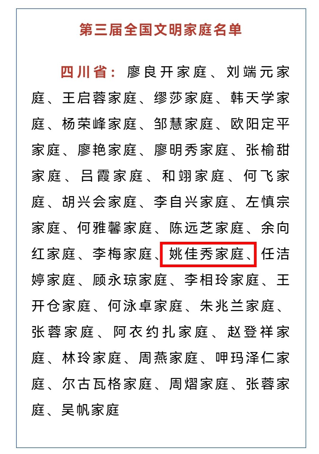 2025年5月23日,中央宣传思想文化工作领导小组发布《关于认定命名第七届全国文明城市、文明村镇、文明单位和第三届全国文明家庭、文明校园的决定》,决定授予尚丽新家庭等798户家庭全国文明家庭称号。其中,乐山职业技术学院马克思主义学院副院长姚佳秀家庭荣获该项荣誉。