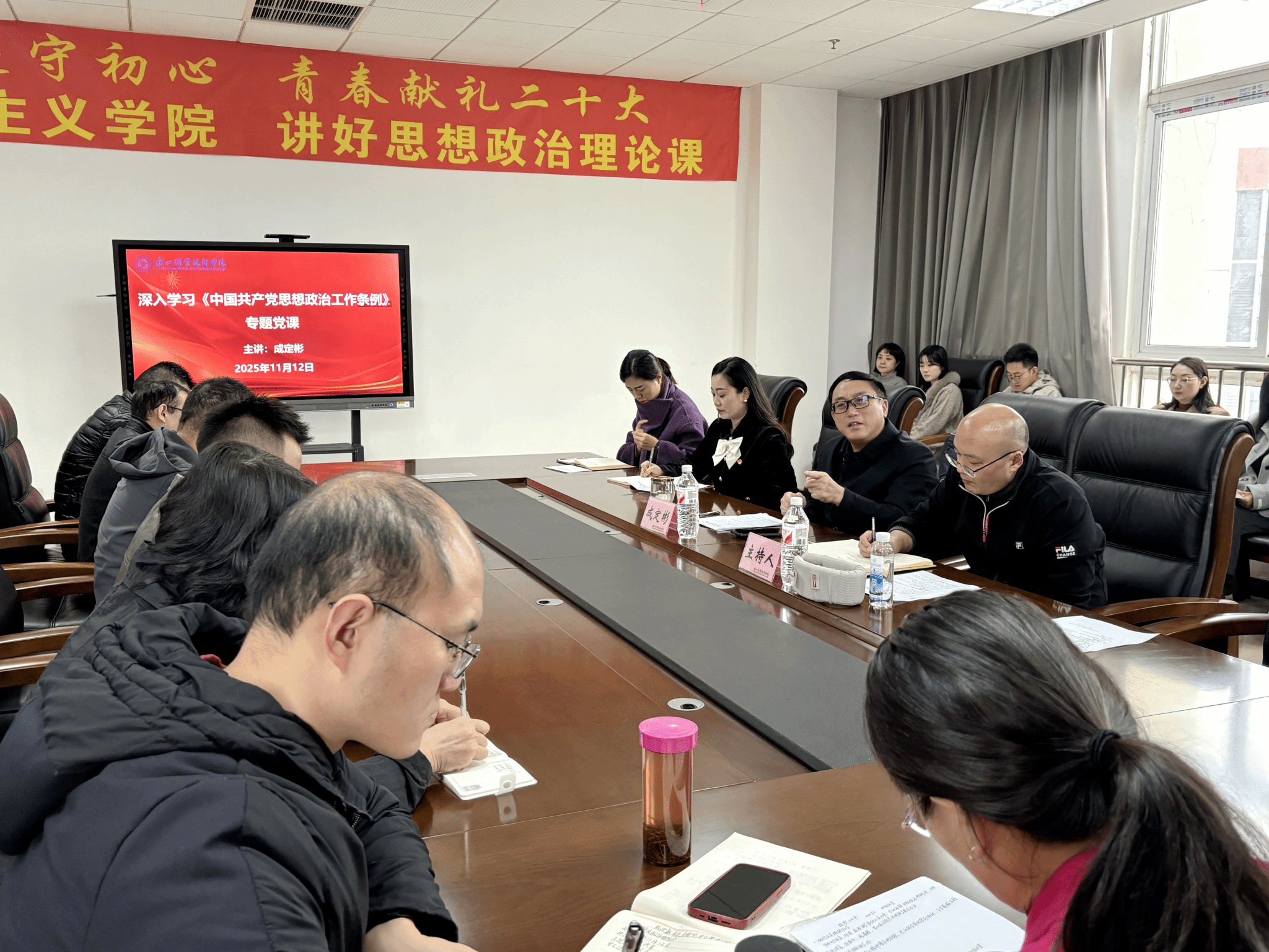 11月12日,学校党委书记成定彬走进马克思主义学院,以“深入学习《中国共产党思想政治工作条例》”为主题讲专题党课并主持召开联系师生座谈会。