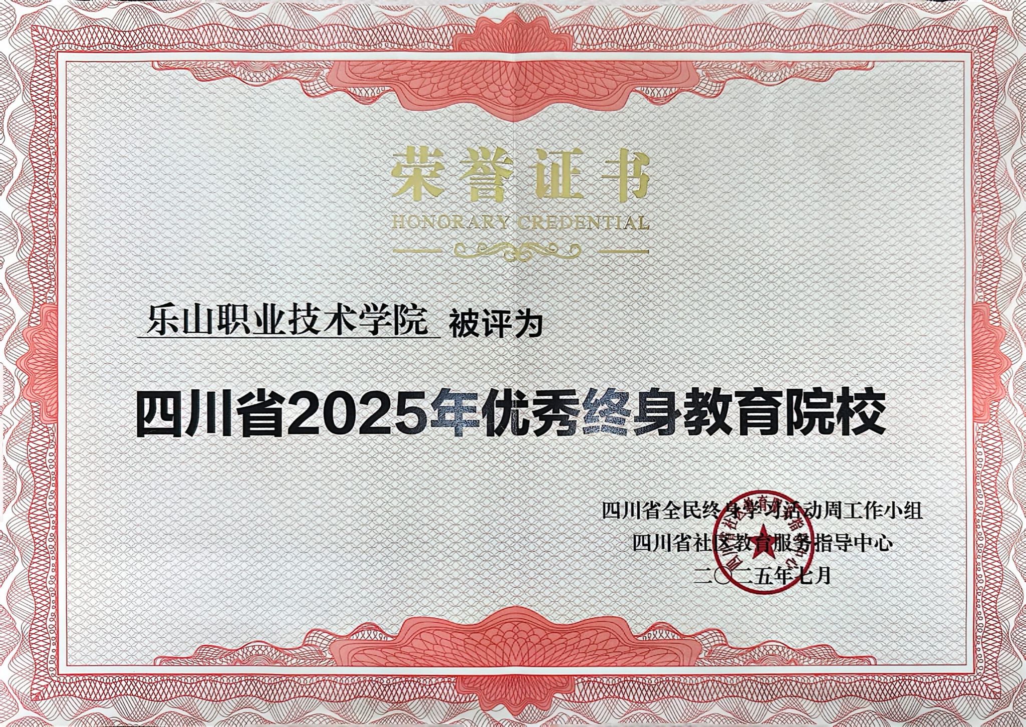 近日,乐山职业技术学院凭借在服务全民终身学习教育体系建设中的突出贡献,被评为“四川省2025年优秀终身教育院校”。