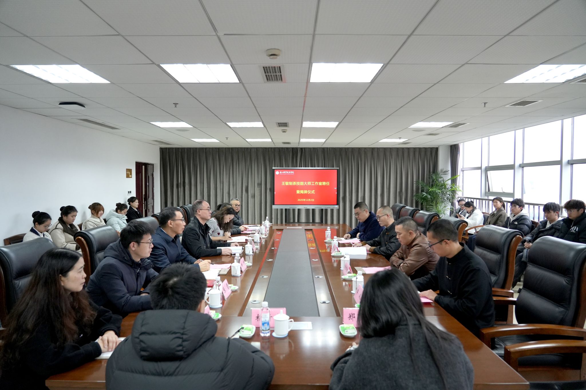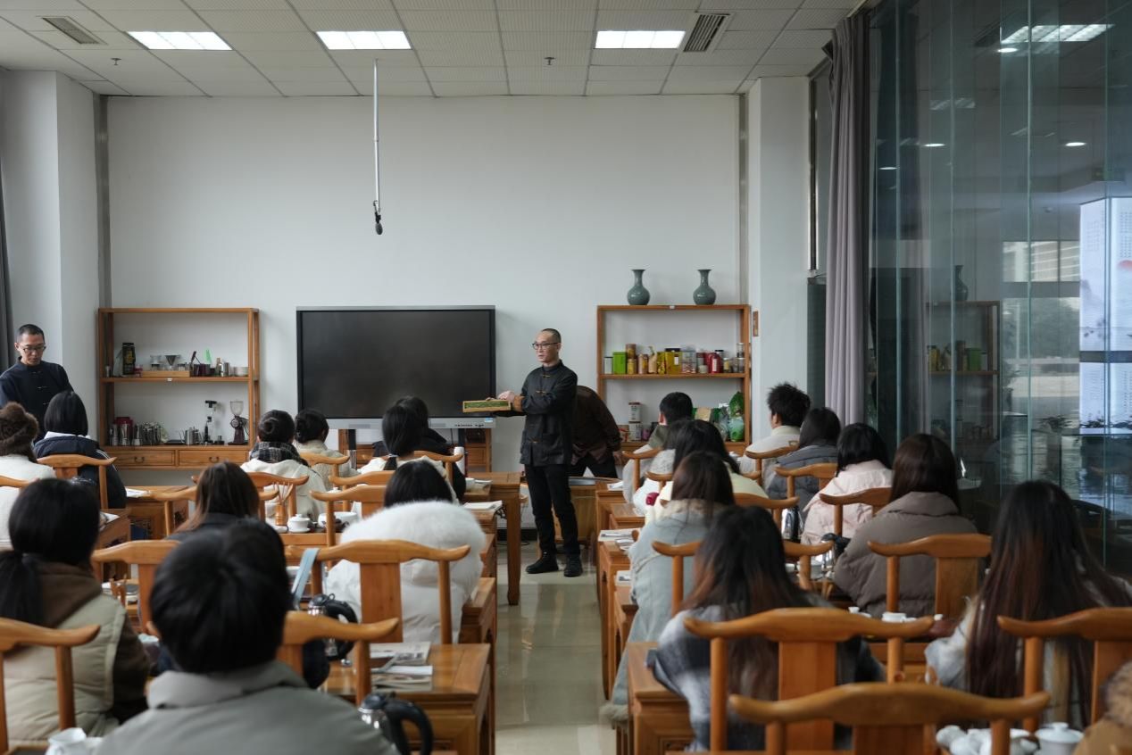 会上,刘忠为王敏颁发了客座教授聘书,举行了大师工作室揭牌仪式。会后,王敏为酒店管理与数字化运营专业师生开展了专题讲座,他从鲜叶甄选、摊青萎凋到炒揉塑形,生动演示峨眉茶传统制作核心工序,详解“看青做青”的古法智慧,并指导师生品鉴标准样茶,让大家直观感受手工茶的“温度与灵魂”。现场同学们踊跃提问,围绕古茶树保护、茶叶品质提升等话题与大师深入交流,沉浸式体验非遗技艺的魅力。