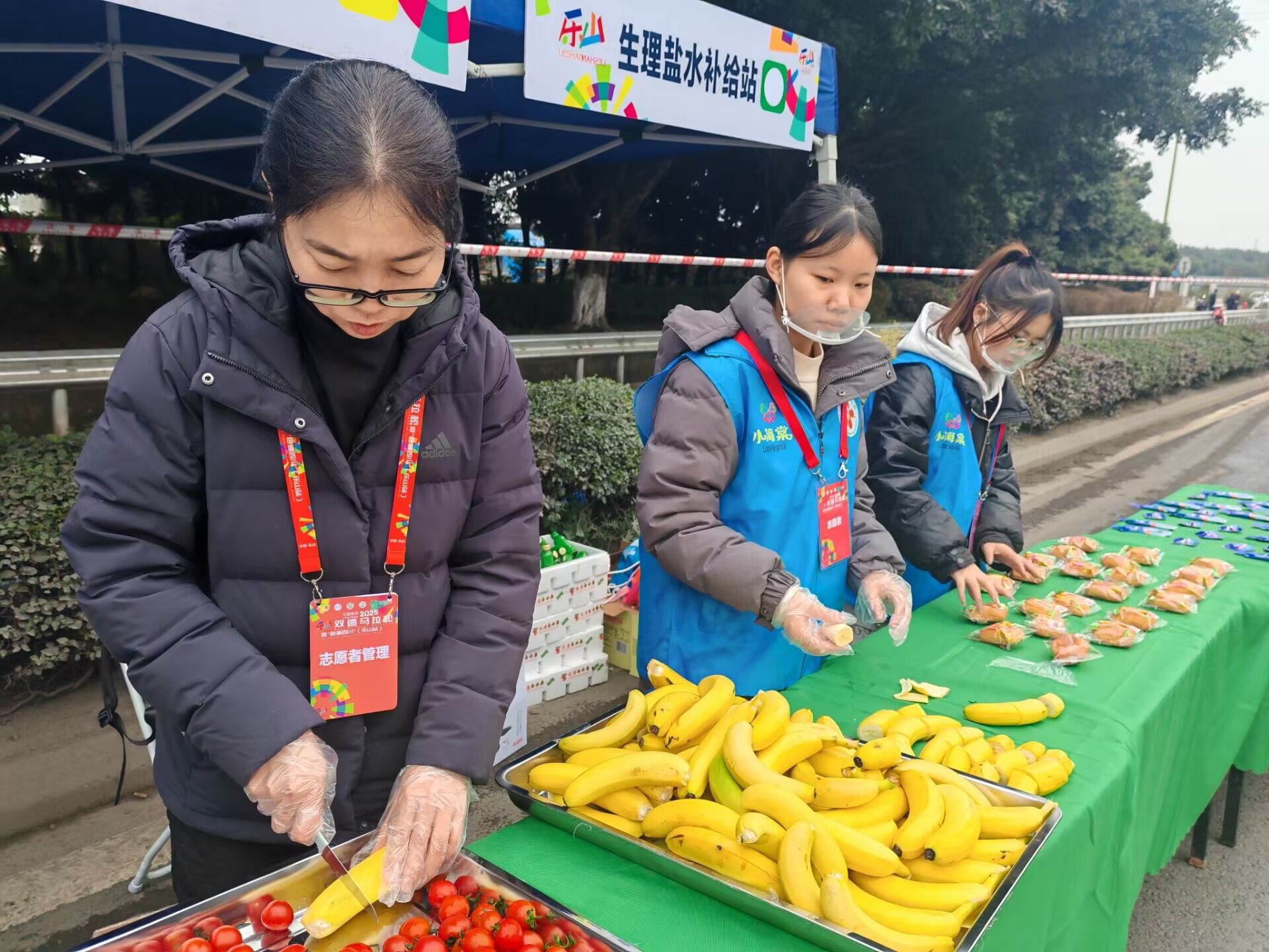 14日凌晨4时,当嘉州大地仍在沉睡,乐山职业技术学院的校园内已灯火通明。673名志愿者准时集结,在校团委张瑞琪、郭胜男、初丽媛、李一和刘俊波老师的统筹下分乘10辆大巴赶赴各服务点位,清晨5时前全部到岗就绪。比赛期间,我校志愿者们的身影遍布42.195公里的全程赛道与21.0975公里的半程赛道。在青衣江一桥补给站,医学专业的志愿者们分工协作,将饮用水和功能饮料提前倒好分装,确保跑者无需减速即可便捷取用;在长青路折返点,护理专业学生组成的医疗辅助团队密切观察选手状态,为体力不支者提供降温擦汗、肌肉放松等服务,累计协助处理轻微抽筋、擦伤等情况43起。来自护理学院的志愿者游志兰惠表示:“课堂上学习的急救知识此刻派上了大用场,能为跑者的安全保驾护航,再冷再累都值得。