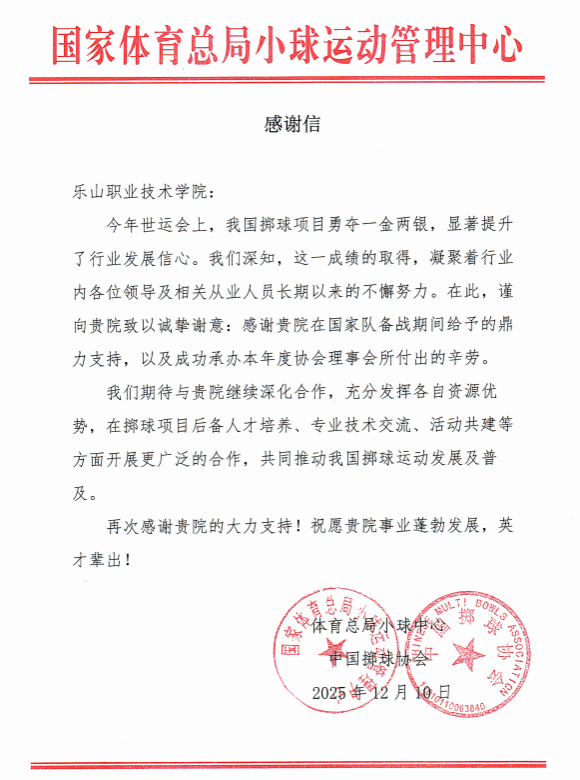 2025年12月10日,学校收到来自国家体育总局小球运动管理中心的一封感谢信。信中,中心对学校成功承办其本年度理事会及相关工作和在2025年世界运动会期间所提供的支持与服务表示认可与感谢。