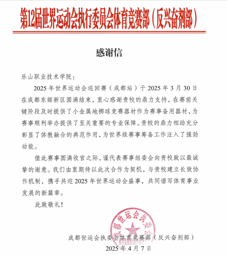 2025年世界运动会国家小金属球队在校集训期间的出行教育理事会的举办及世运会相关工作开展期间,乐山职业技术学院以高度的责任意识、专业的组织能力和高效的团队协作,保障了各项活动的圆满顺利实施,为中心相关工作提供了有力支撑,展现了学校优良的办学风貌与管理水平。