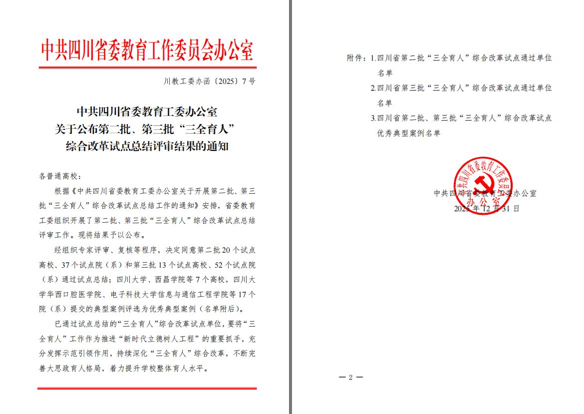 近日,全省高校第二批、第三批“三全育人”综合改革试点总结评审结果公布,乐山职业技术学院顺利通过“三全育人”试点高校综合改革试点总结评审,学校新能源与材料学院顺利通过“三全育人”试点院(系)综合改革试点总结评审。