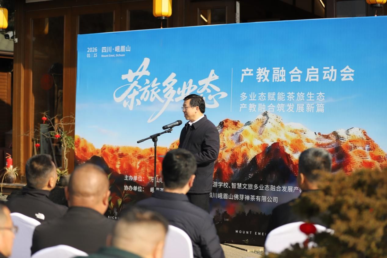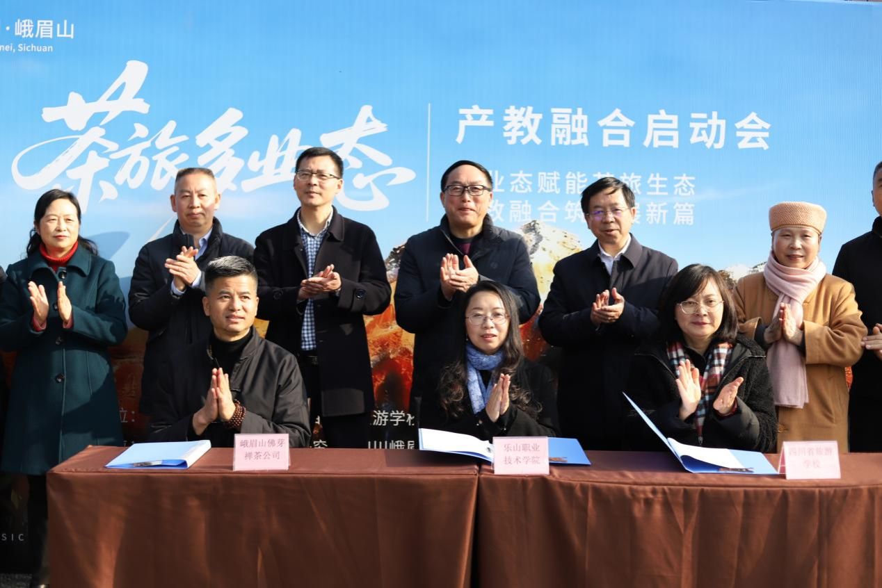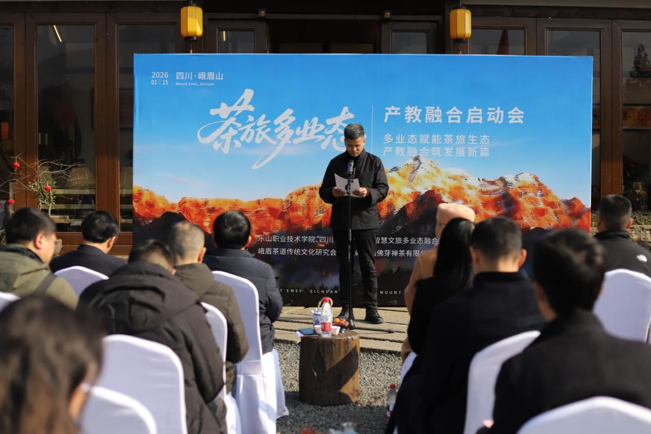 2026年1月15日,由乐山职业技术学院、四川省旅游学校联合主办,峨眉山佛芽禅茶有限公司协办的“茶旅多业态产教融合启动会”在峨眉山佛芽禅茶庄园隆重举行。学校党委书记成定彬,四川省旅游学校党委书记、校长赵晓鸿,峨眉山佛芽禅茶有限公司董事长谯英成,学校党委委员、副校长周芹,乐山市政协副秘书长万谦,乐山市农业农村局副局长杨波,乐山市文化广播电视和旅游局四级调研员文勇,乐山市教育局总督学陈凯,峨眉山市政协党组副书记、副主席邹利琼等领导及相关院校、企业、地方政府代表50余人出席会议,会议由四川省旅游学校副校长吴越强主持。