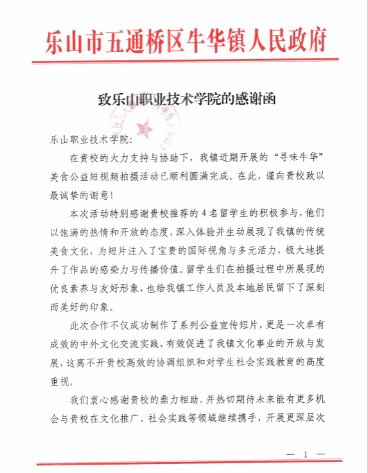 近日,五通桥区牛华镇人民政府向乐山职业技术学院发来感谢函,对我校在“寻味牛华”美食公益短视频拍摄活动中给予的大力支持与协助表示衷心感谢。感谢函中特别提到,我校推荐的4名留学生以饱满的热情和开放的态度深入参与拍摄,为展现牛华传统美食文化注入了宝贵的国际视角与多元活力,极大提升了作品的感染力与传播价值。