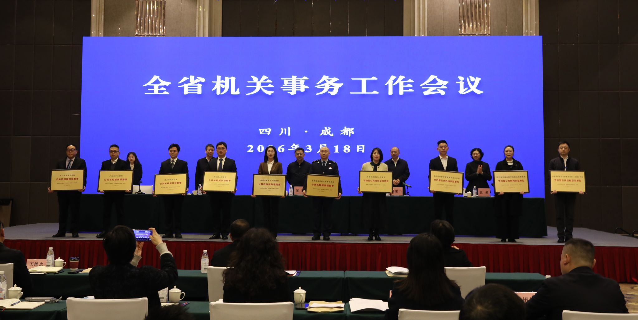 3月18日,2026年全省机关事务工作会议在成都召开。在此次会议上,经国家机关事务管理局同意,省机关事务管理局向全省获得国家公共机构能效领跑者的单位进行授牌。学校党委书记成定彬受邀参会,并现场领取了奖牌。