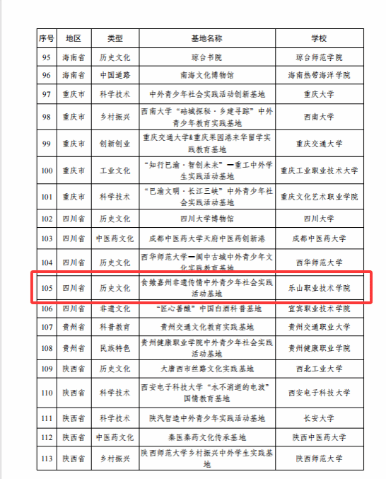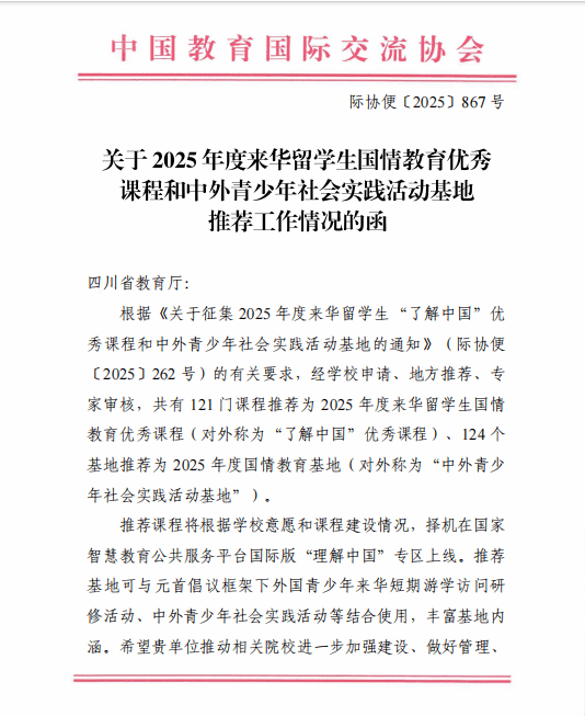 近日,根据中国教育国际交流协会发布的《关于2025年度来华留学生国情教育优秀课程和中外青少年社会实践活动基地推荐工作情况的函》(际协便〔2025〕867号),乐山职业技术学院申报的“食飨嘉州 非遗传情”中外青少年社会实践活动基地成功入选2025年度中外青少年社会实践活动基地推荐名单。